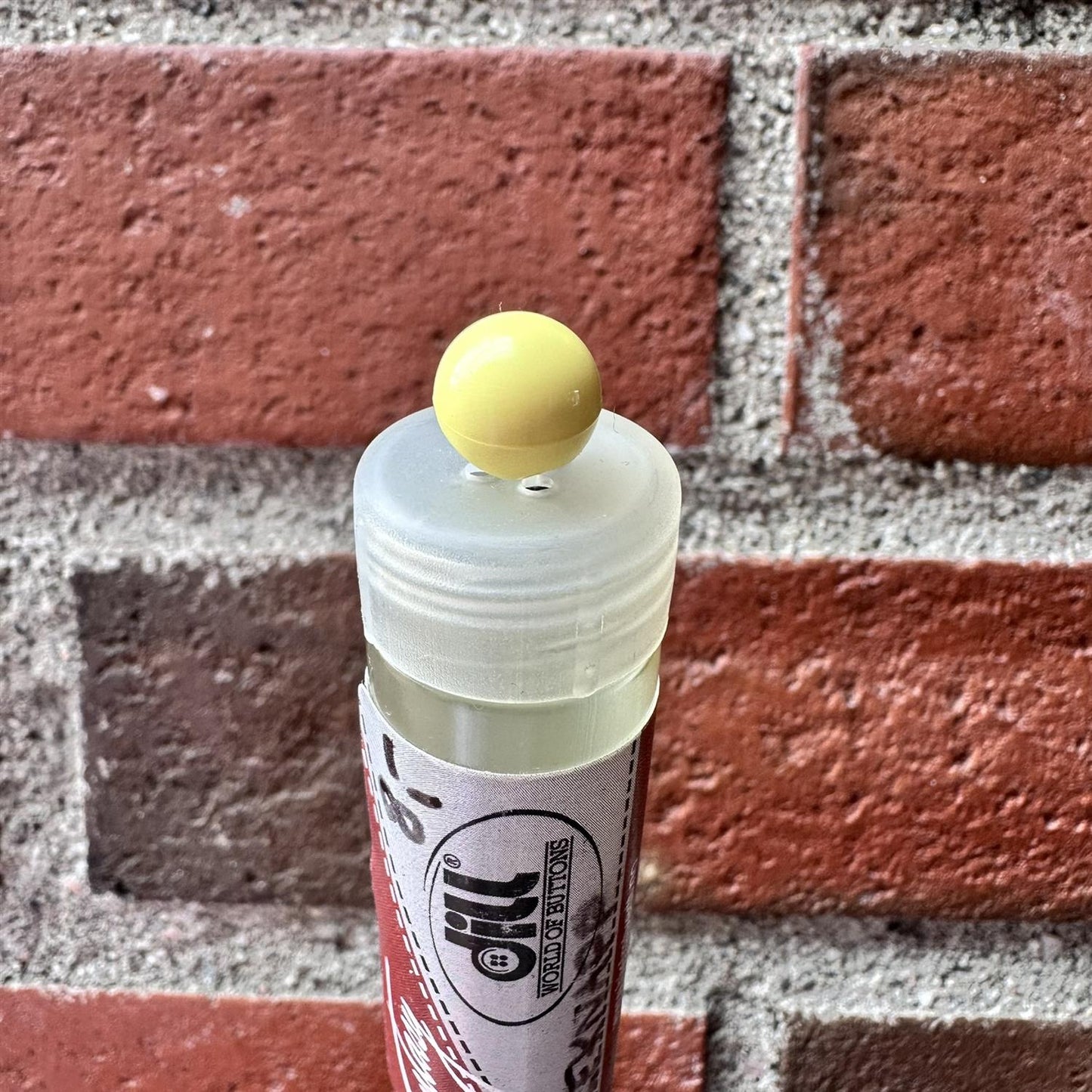 Kuleformet liten knapp i plast.
