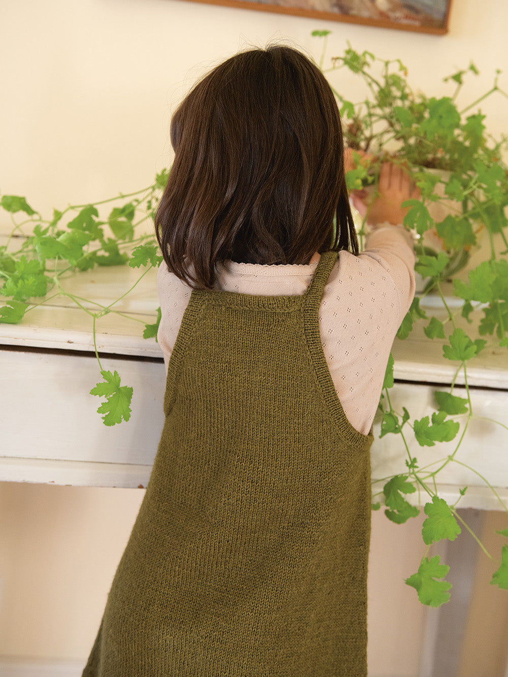 Først strikkes forstykket frem og tilbake med økninger. Deretter strikkes bakstykket på samme måte, før arbeidet samles og det strikkes rundt med økninger. Skjørtet avsluttes med en glattstrikket kant som felles av med heklenål. Ermekanter og stropper strikkes til slutt, og felles av på samme måte. Man kan velge å strikke stroppene med eller uten knapphull.