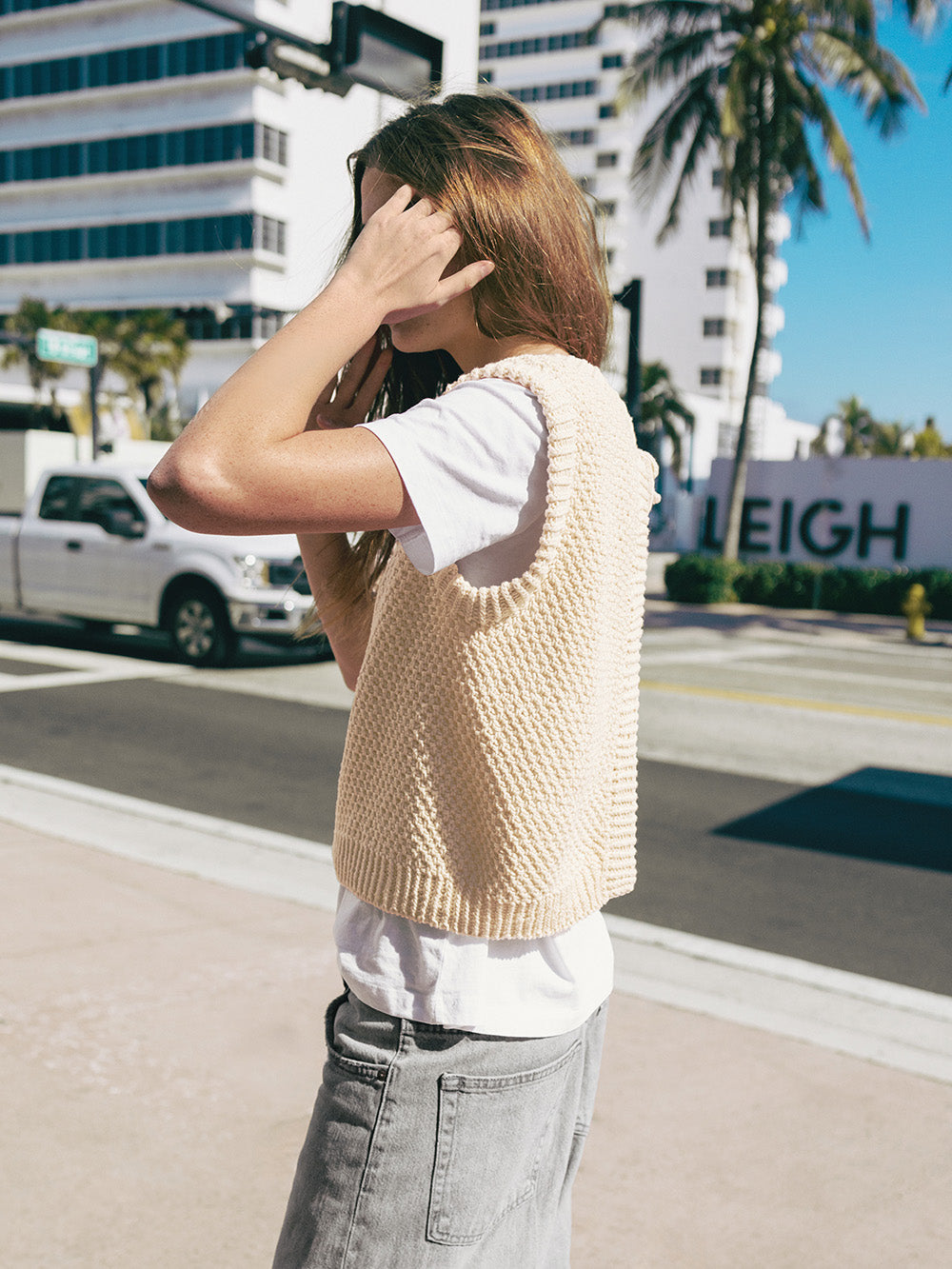 Ermekanter, forkanter og halskant strikkes i vrangbord. Velg mellom å strikke snor til å tre gjennom hullene i halskanten for å lukke toppen, eller å lukke den med en knapp eller et bånd.