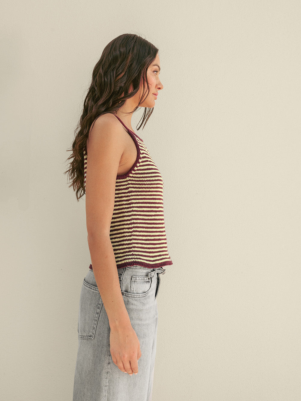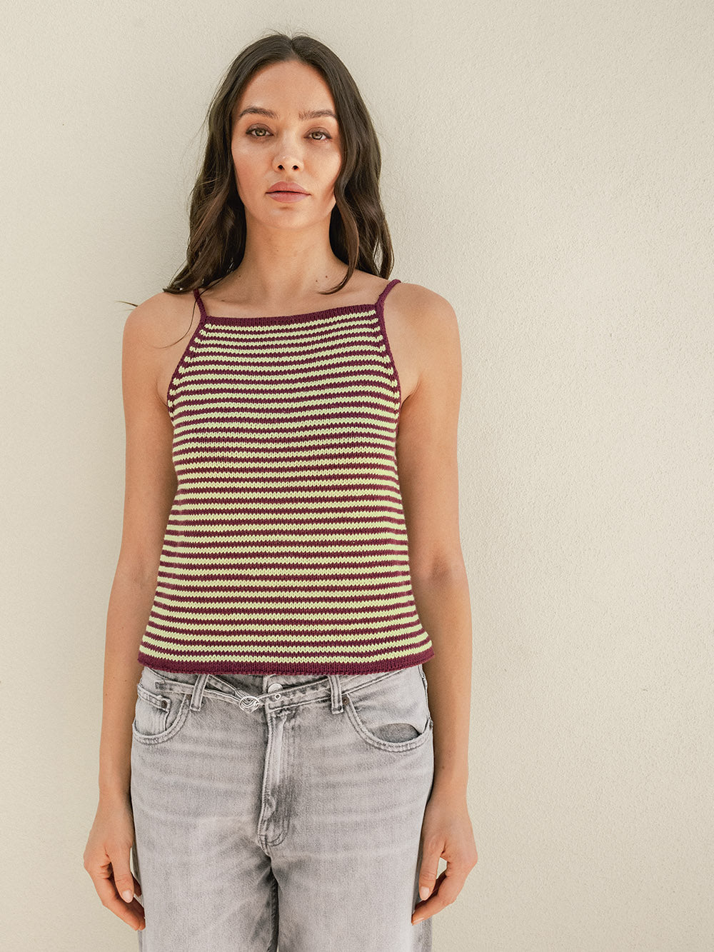 Singleten strikkes ovenfra og ned i stripemønster med MANDARIN PETIT og TYNN LINE.