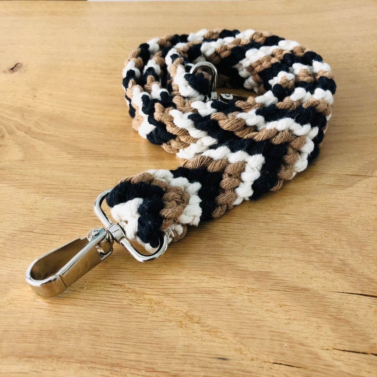 This macramé bag strap is a great addition to you DIY hand bag and a practical accessory for you hand held camera. The macramé strap is easy to snap onto your bag with the extra-large musketon hooks. The macramé knots for this bag strap are very suitable for beginners. This project is a great stash buster and ready in just a few hours. You will use around 12 metres of Spesso for each colour. This length is enough for an adult size crossbody strap.