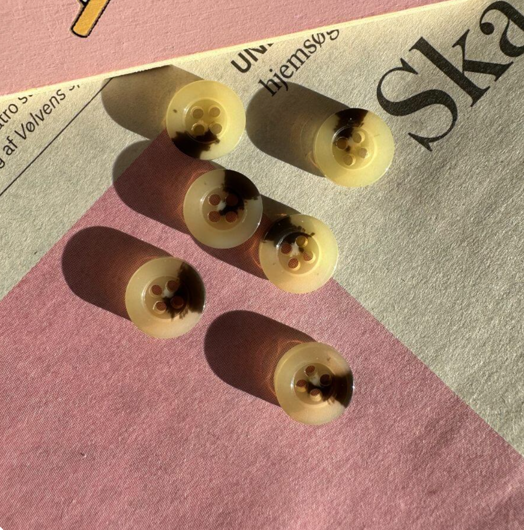 Galalitt er et bionedbrytbart materiale laget av melkeproteinet kasein. Kaseinet til knappene er et restprodukt fra irsk melkeproduksjon, som ellers ville vært kastet.