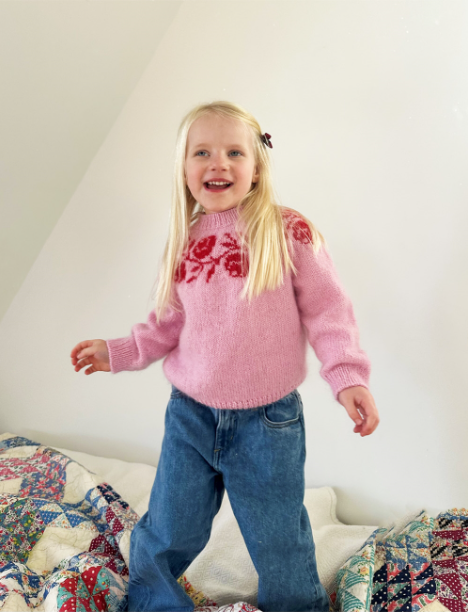 Rosie Yoke Sweater junior strikkes ovenfra, og roseborden strikkes inn i det runde bærestykket. Resten av blusen er helt enkel i glattstrikk og med ribbkanter.