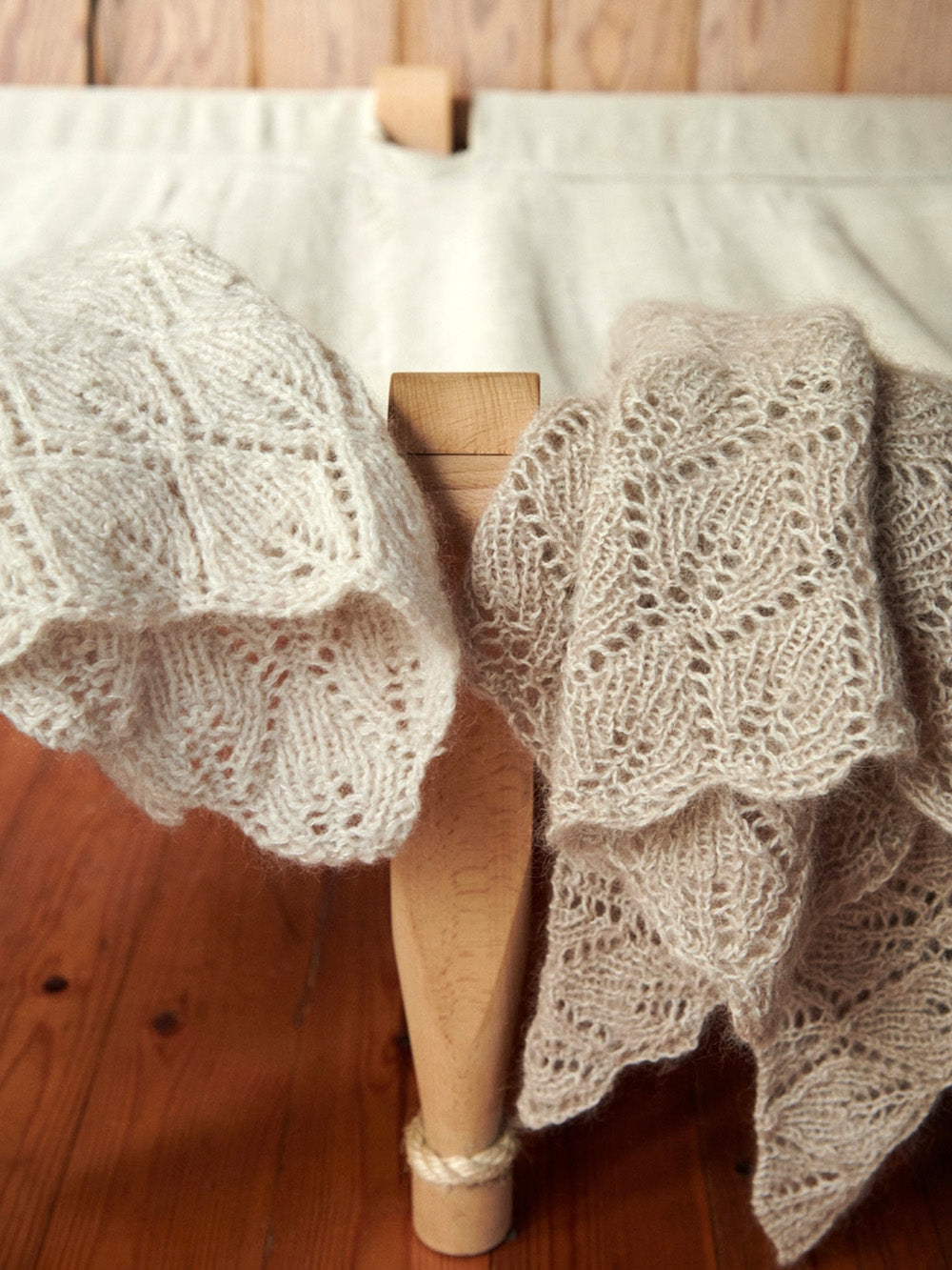 Beige skjerf: 1 mønster = 8 cm i bredden på p nr. 3,5 strikket med 1 tråd av hver kvalitet.