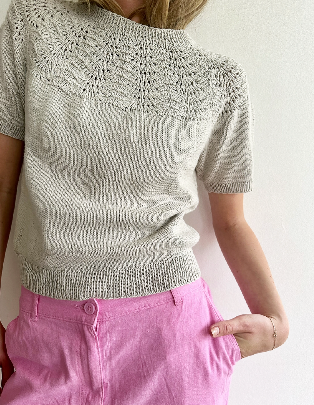 Peacock shirt strikkes oppefra, og halsudskæringen dannes ved hjælp af vendepinde efter halskanten er strikket. De enkle kombinationer af hulmønster og vrangmasker på bærestykket danner en delikat struktur, der samtidig er nem og underholdende at strikke.