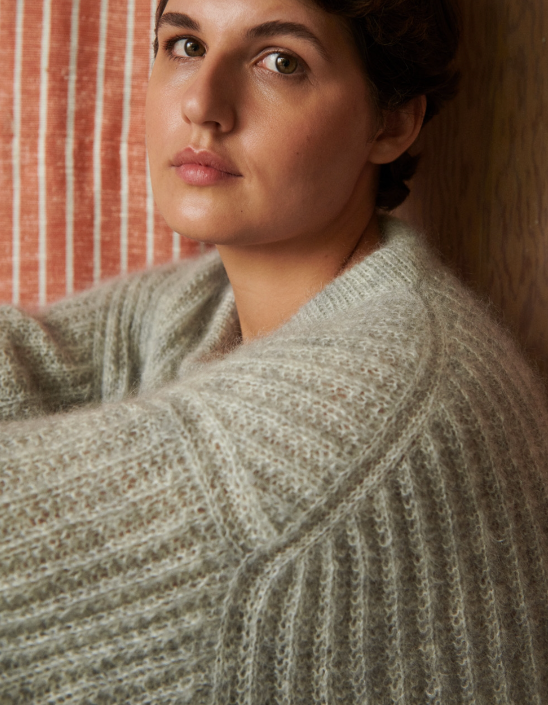 Charlie Blouse er kun strikket i rett- og vrangmasker. Selv om det ligner på patentstrikk, er mønsteret mye enklere å strikke. Økningene og fellingene danner fine, spennende linjer, som patantstrikk også kan gjøre. Charlie er strikket i to tråder med tynn mohair, og det gjør den lett og luftig tross strukturmønsteret.