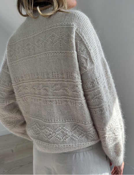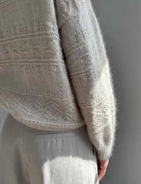 Porcelain Damask Sweater har 3 fine border på bolen og 2 på ermene. Mønsterbordene strikkes etter diagram, utelukkende med rett- og vrangmasker. Mellom bordene strikkes det glattstrikk. Porcelain Damask Sweater strikkes ovenfra med skrå skuldre.