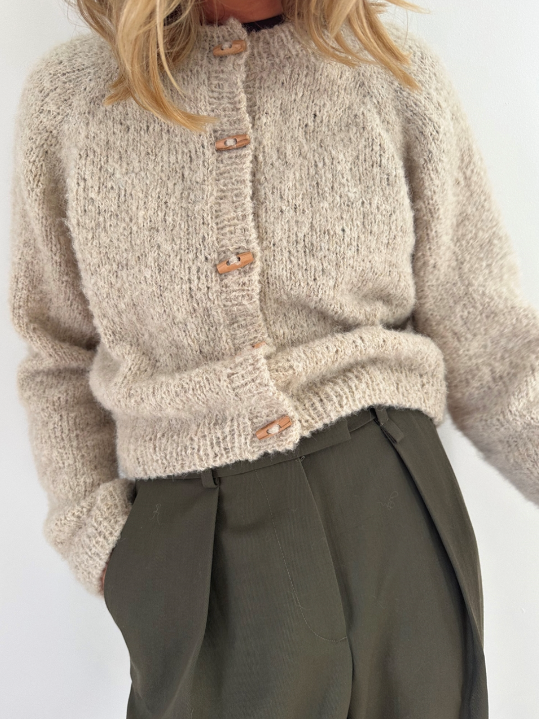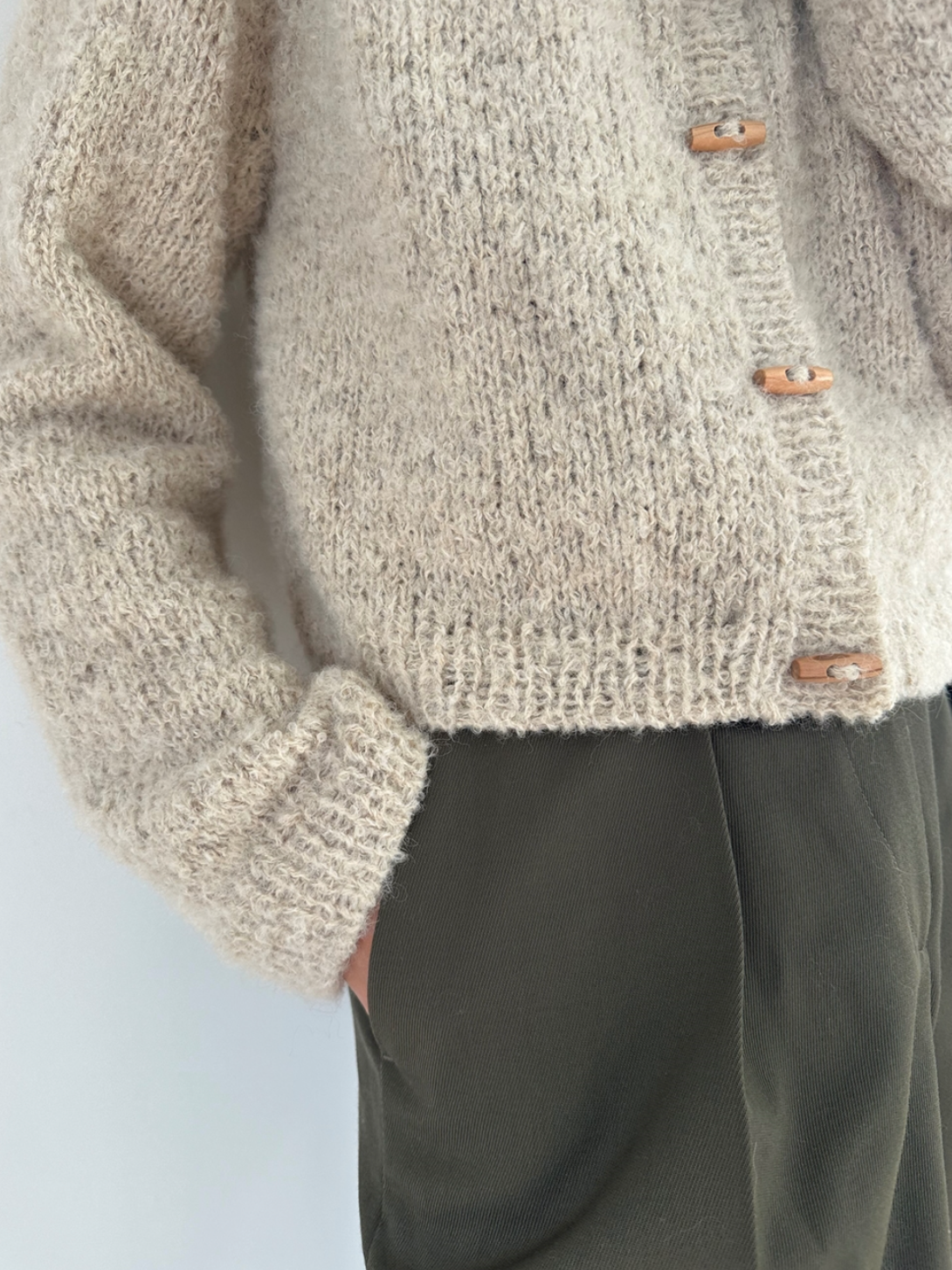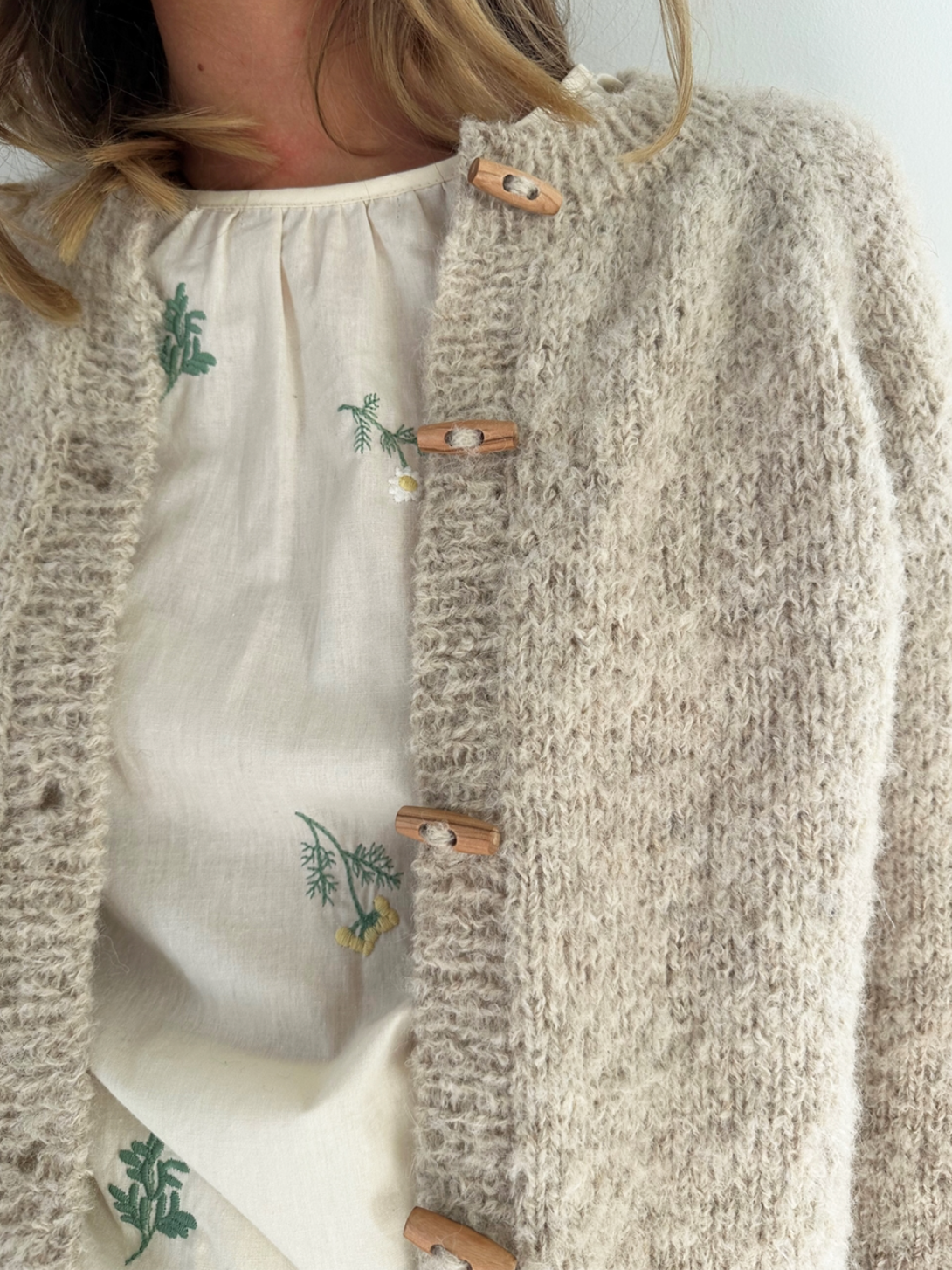 5 knapper. Cardigan i bouclé har duffel-knapper, 3 cm lange.