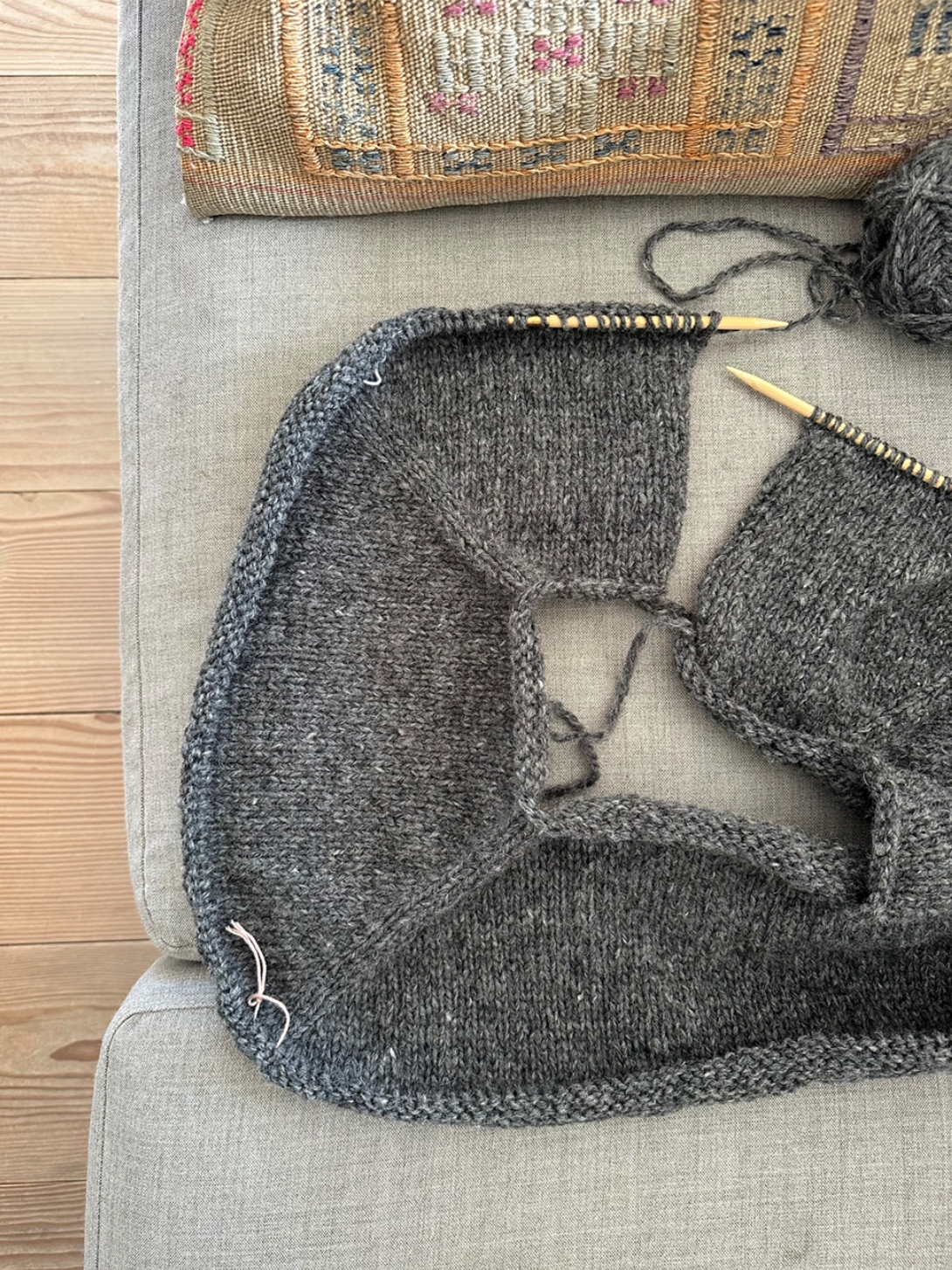 Foundation Cardigan er er ment å ha en bevegelsesvidde på ca. 12-20 cm. Her er jakken i bouclé vist med en bevegelsesvidde på 16 cm. Den grå jakken er vist med en bevegelsesvidde på 24 cm og er strikket 5 cm lengre. Dvs. velg en størrelse større eller mindre hvis du ønsker mer eller mindre bevegelsesvidde. Det er også enkelt å justere lengden.