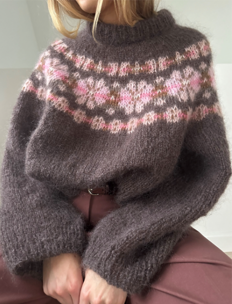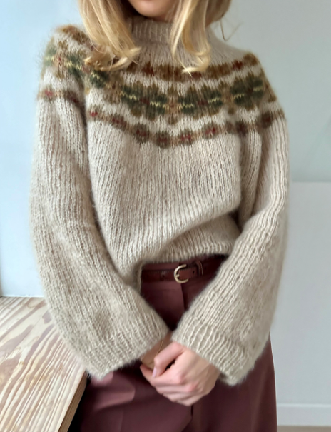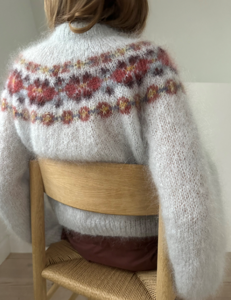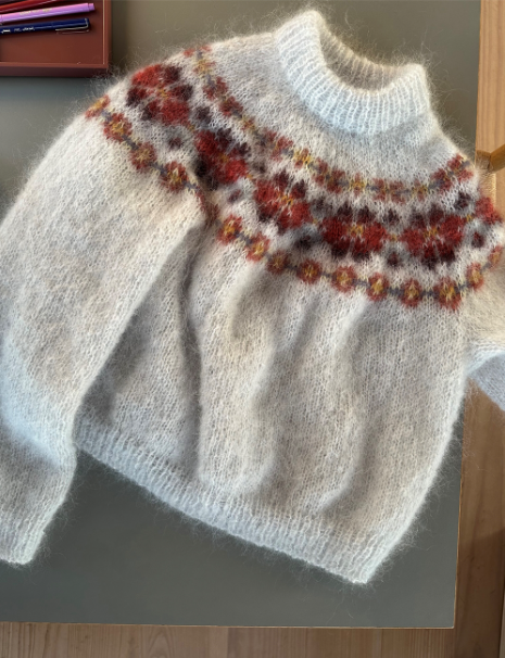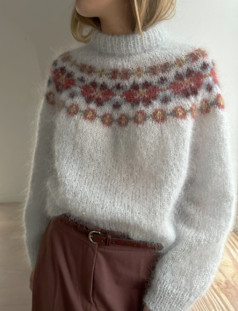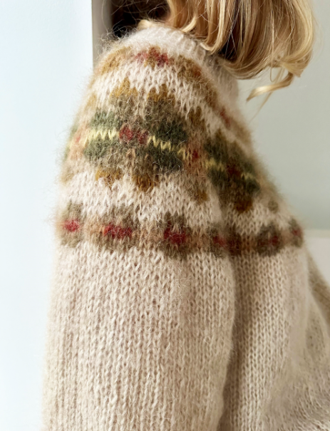 Margaret Sweater er en fin genser å strikke for å få brukt opp mohairrester på. Genseren har Fair Isle mønster på det runde bærestykket, og i slikt mønster skifter både bunnfarge og mønsterfarge, men man strikker alltid med høyst to farger om gangen. For å gjøre det enkelt for deg inneholder oppskriften fem konkrete fargeforslag.