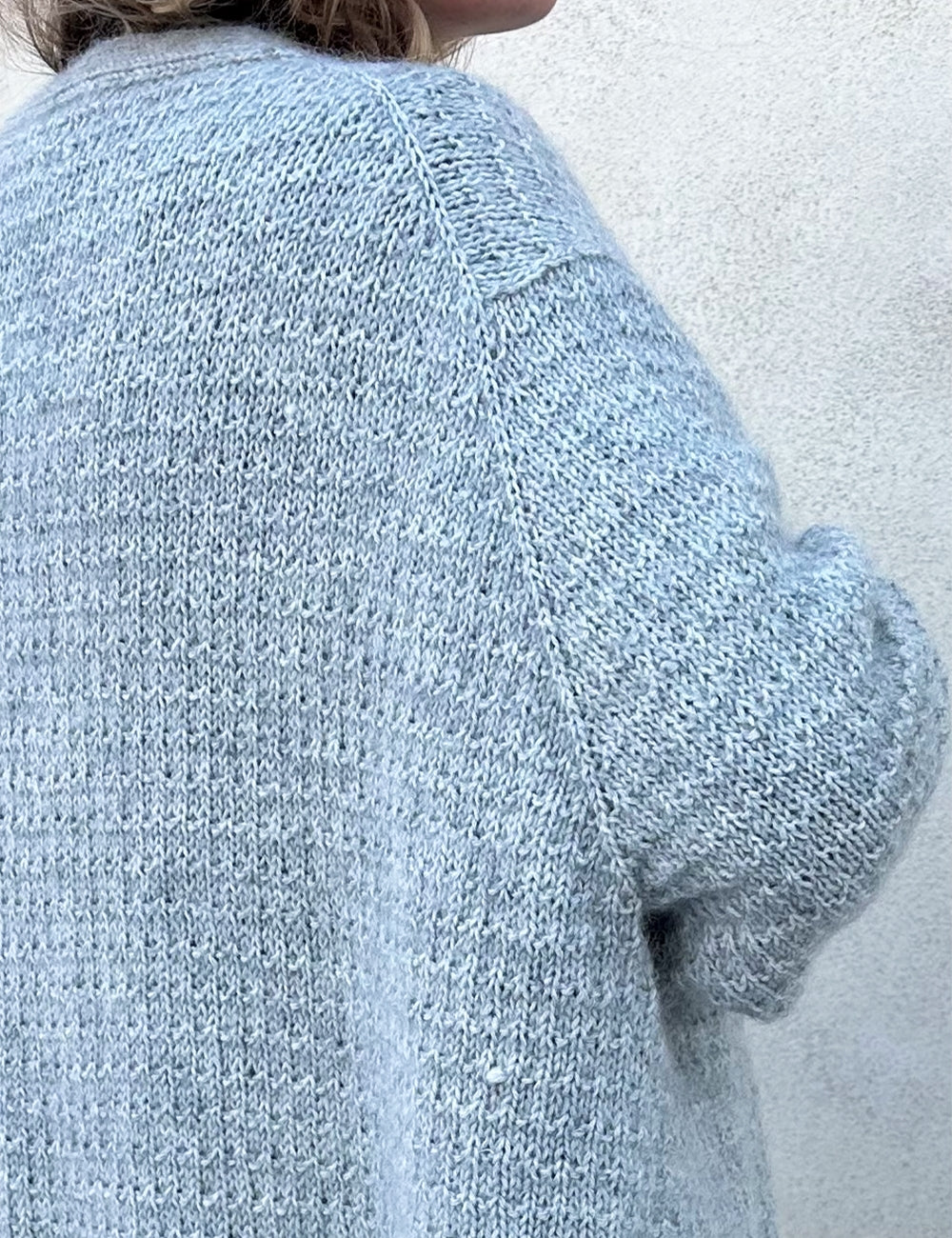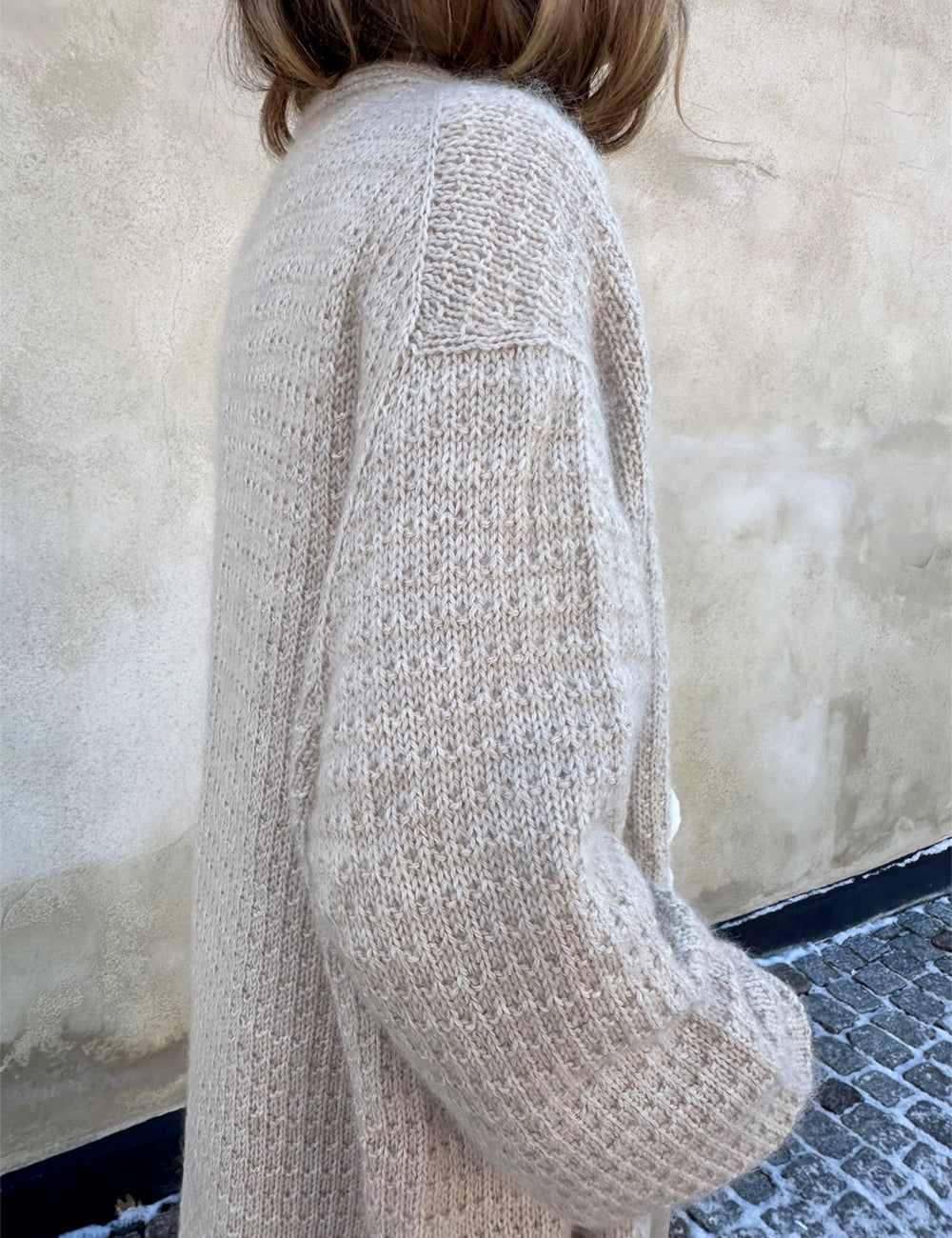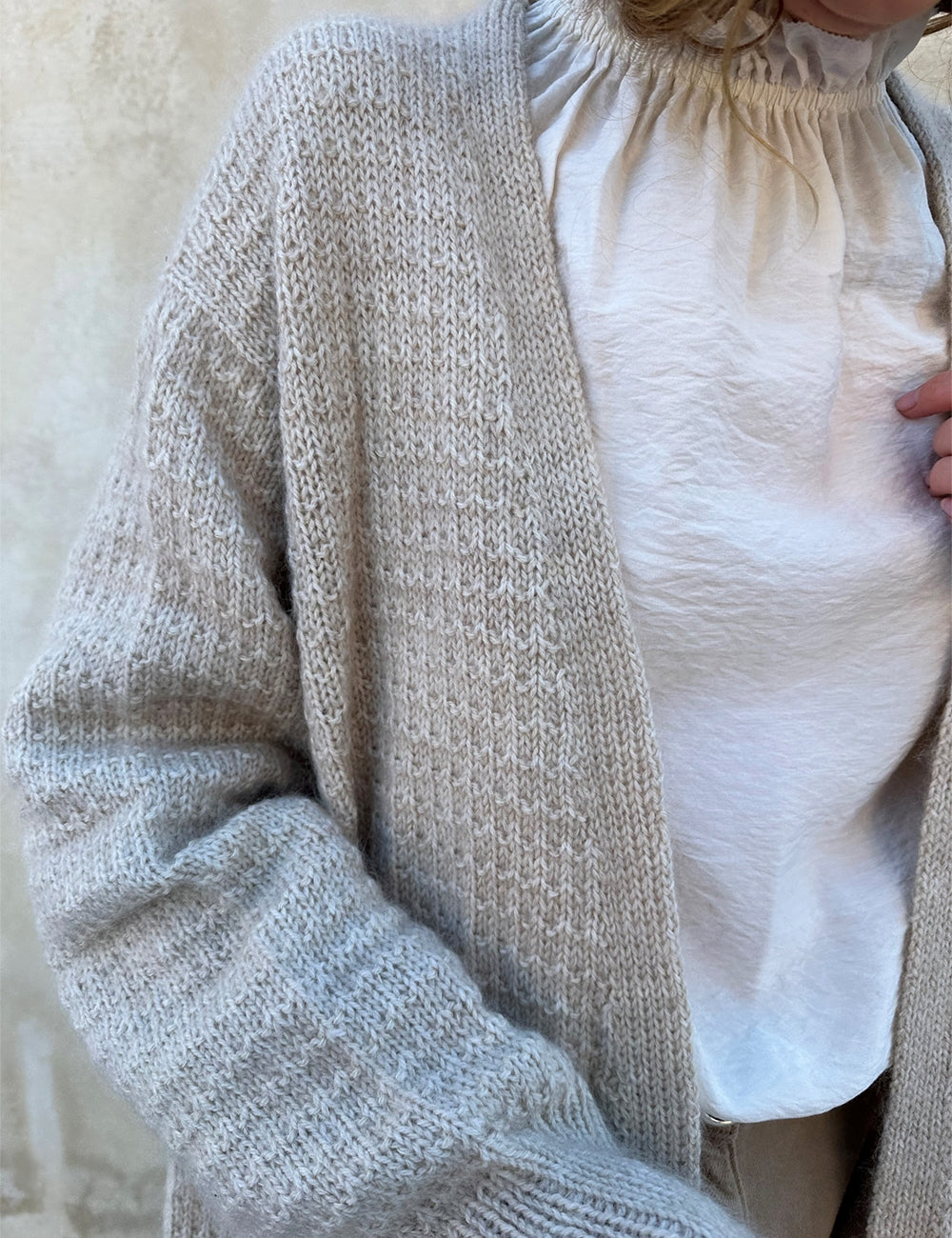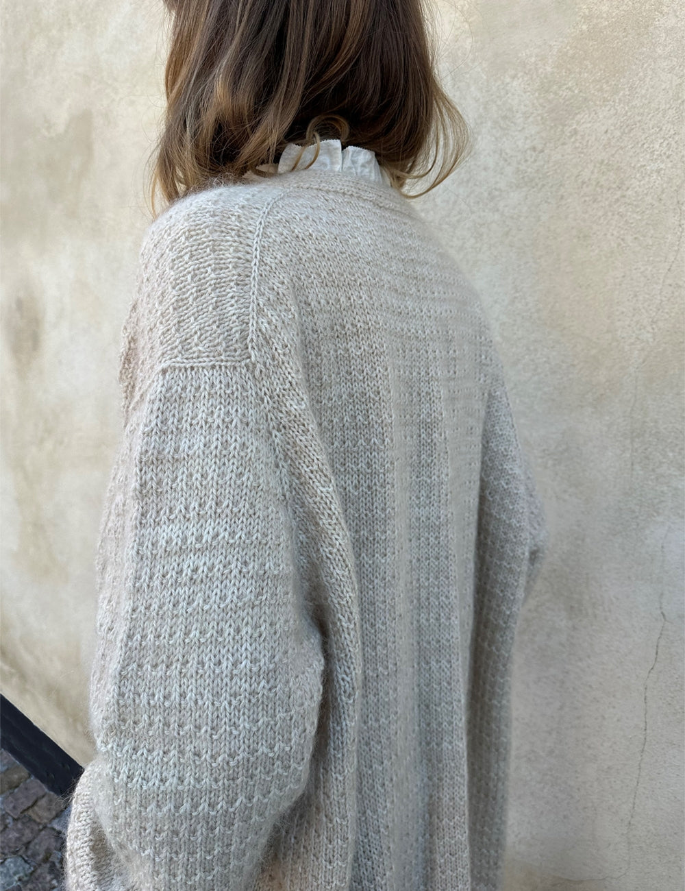 Caia Cardigan strikkes ovenfra. Den har en interessant konstruksjon, som samtidig gir en god passform og er både underholdende og enkel å strikke. Prikken over i-en er den loddrette ribbkanten langs forkantene og v-halsen, som strikkes fast til cardiganen samtidig med at den strikkes.