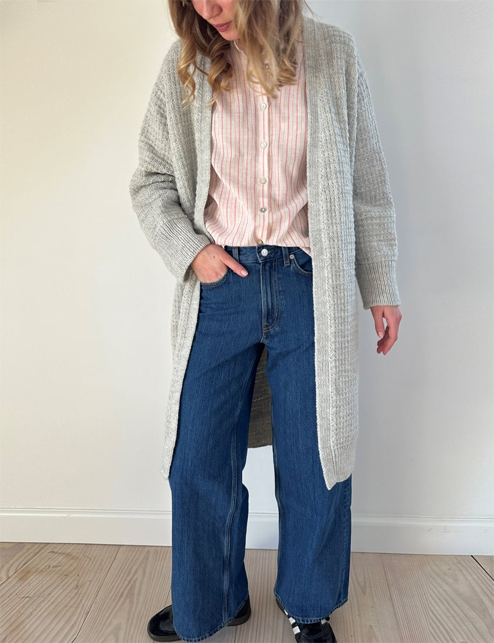 Garn og garnmengde, lys grå cardigan i ull (med stripete skjorte under)