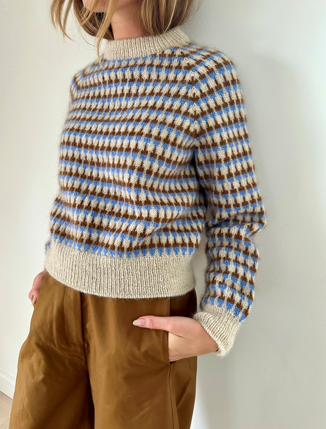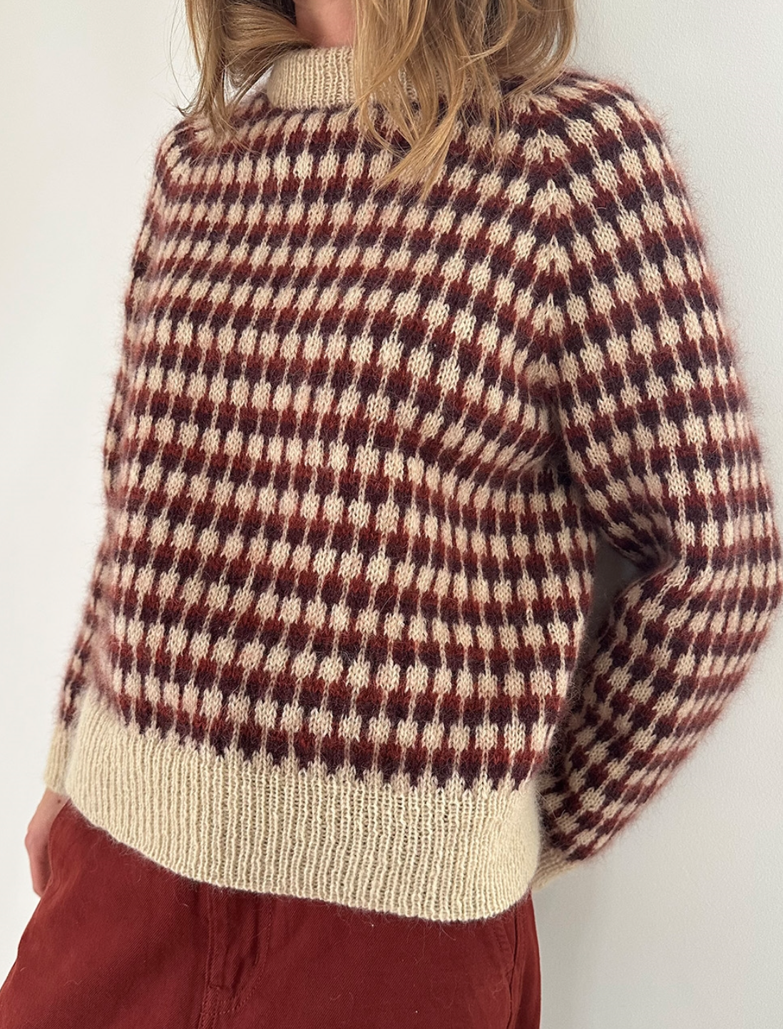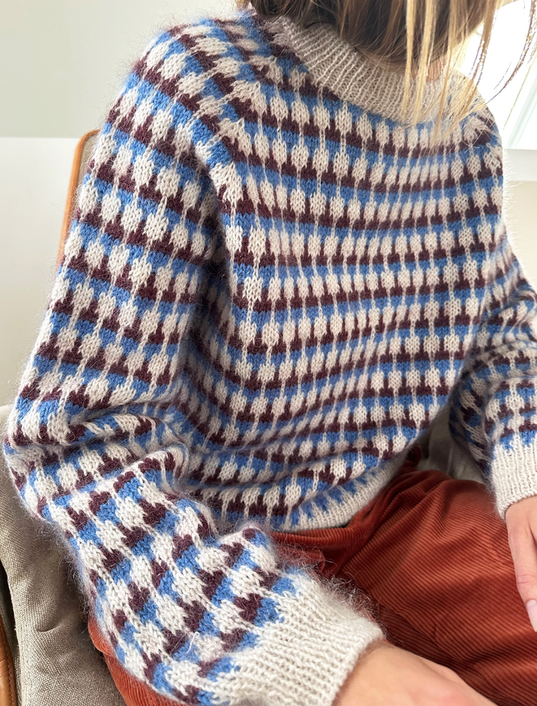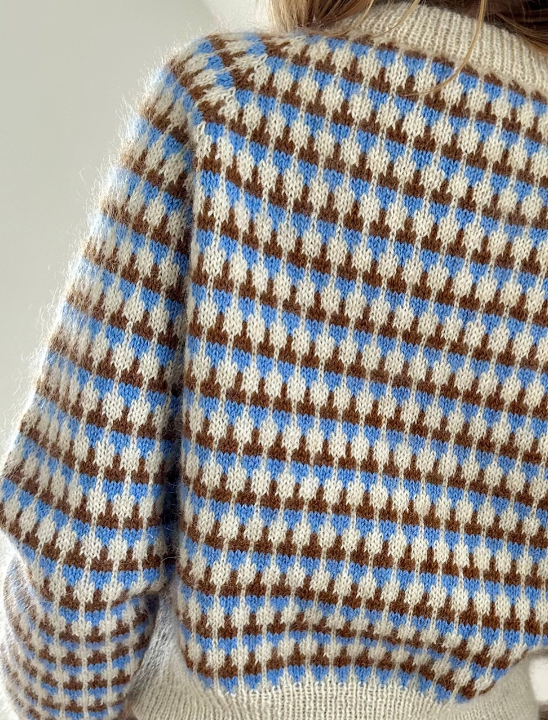 Facet Sweater er en raglangenser med et grafisk mønster. Mønsteret består av tre farger, men det strikkes bare med to farger om gangen, og trådsprangene er korte, noe som gjør den enklere å strikke. Fordi det ikke brukes så mye garn, spesielt til mønsterfargene, er Facet Sweater et opplagt prosjekt til garnrestene dine. Du kan også ”leke” med mønsteret og strikke det med flere enn to mønsterfarger.