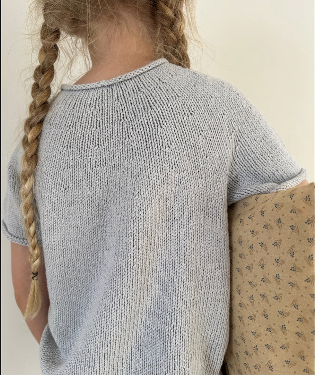 Størrelserne (2) 4 (6) 8 (10) 12 år tilsvarer en høyde på (92) 104 (116) 128 (140) 152 cm og en personlig overvidde på cirka (54) 57 (61) 65 (71) 77 cm. Velg den størrelsen som passer best med barnets overvidde. Det er enkelt å regulere lengden på bol og ermer, da T-skjorten strikkes ovenfra. Plain Yoke Tee 20 junior er ment å ha en bevegelsesvidde (positive ease) på ca. 6-12 cm. Den vises her med en bevegelsesvidde på 10 cm.