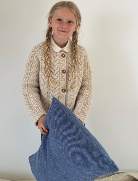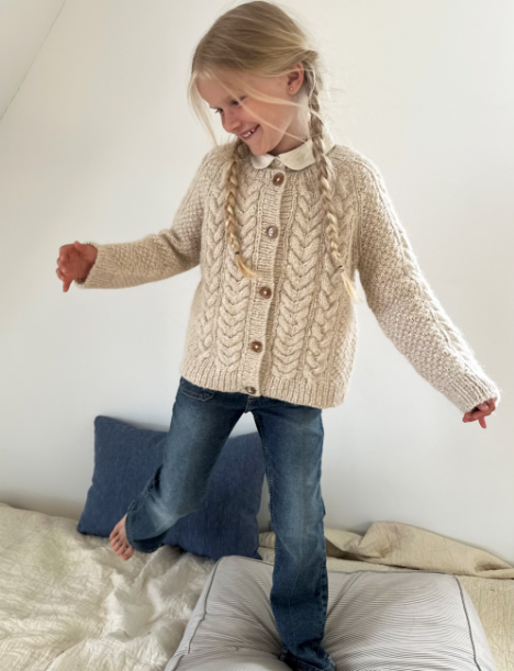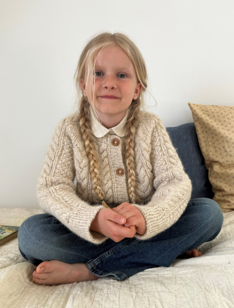 Siri Cardigan junior på bildene er strikket i Sandnes Garn Poppy