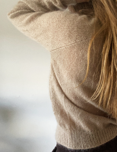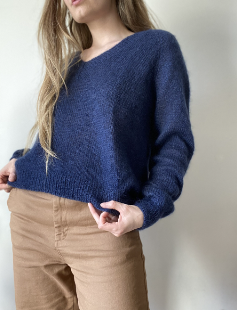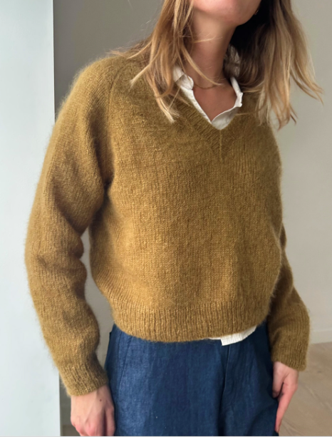 Vega har V-hals og en raglanfasong som er ekstra fin, fordi det økes forskjellig på ermer og for-/bakstykke.
