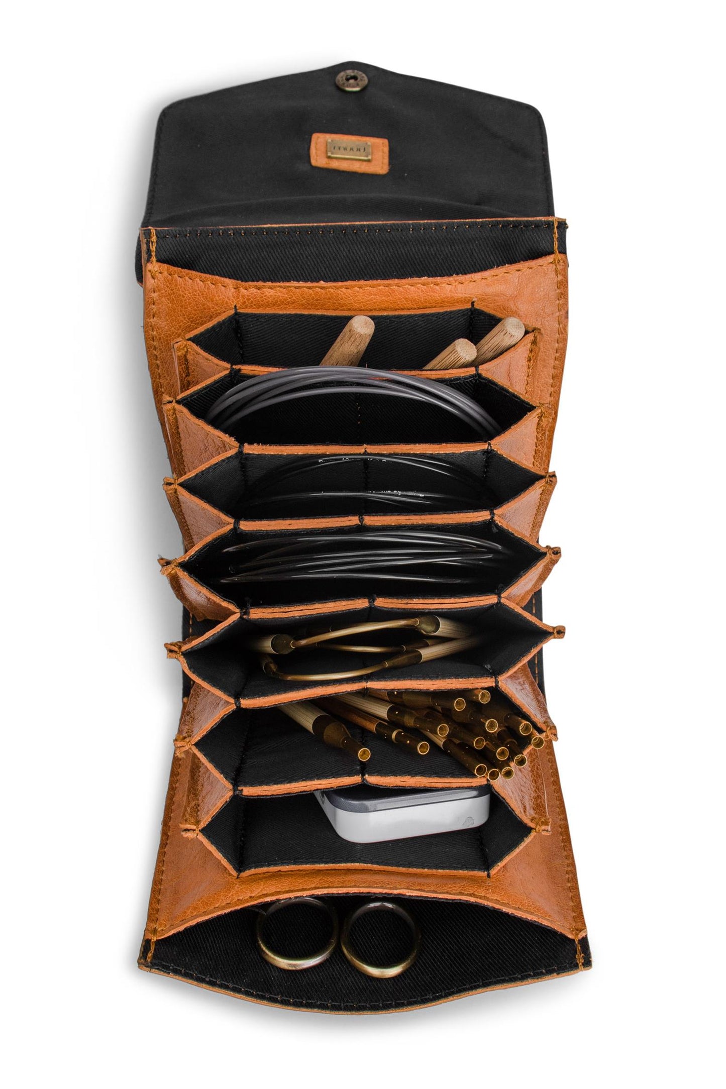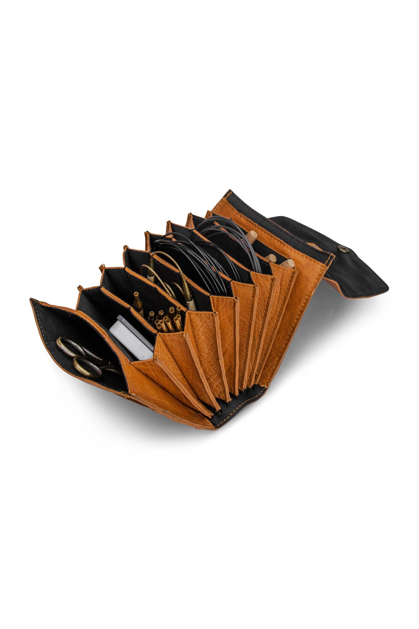 Etuiet er håndlavet i blødt kvalitetslæder, som kun bliver smukkere med tiden. Pindeetuiet lukkes med en trykknap, så dit strikkegrej bliver i etuiet, når det ligger i en taske. Trykknappen kan lukkes i to størrelser, så du kan vælge den, der passer til dit indhold.