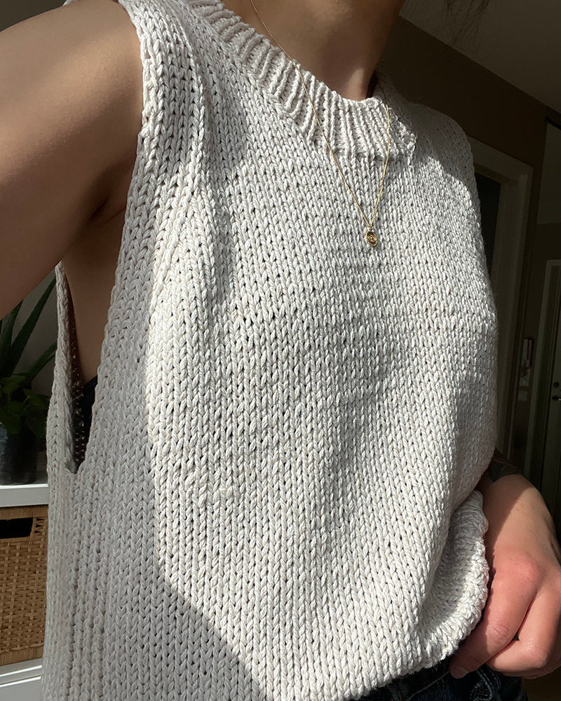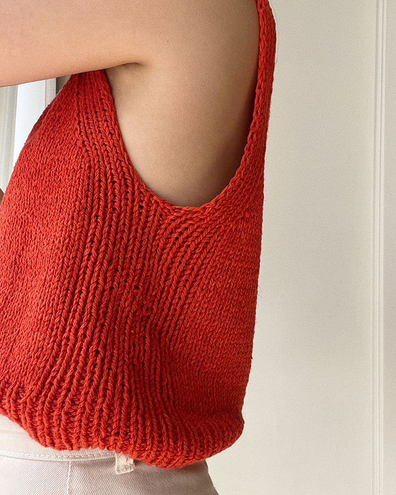 Montpellier Top er en sommertopp som strikkes ovenfra og ned. Først strikkes bakstykket, før det plukkes opp masker for å danne skulder- og halsutskjæringen. I hver side strikkes det kantmasker i ribbestruktur. Etter hvert samles maskene fra for- og bakstykket, og bolen strikkes rundt i glattstrikk samtidig som ribbestrukturen fortsettes. Bolen avsluttes med vrangbord, og til slutt plukkes det opp masker til halsen som strikkes i vrangbord. Se anbefalte hjelpevideoer på www.novemberknits.com.