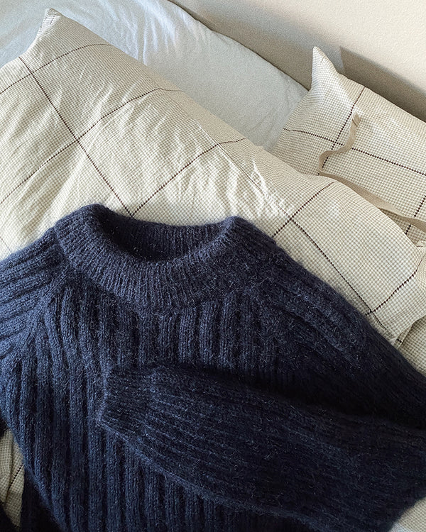 Eira Sweater er en ribbestrikket genser som strikkes ovenfra og ned med raglanøkninger, med en ribbestruktur i 3 rett, 2 vrang. Halsen brettes dobbelt, og det strikkes vendepinner i nakken for å danne halsutskjæringen. Bolen avsluttes med elastisk avfelling, og ermene avsluttes med en bred vrangbord. Anbefalte hjelpevideoer er listet nederst i oppskriften.