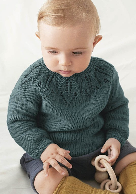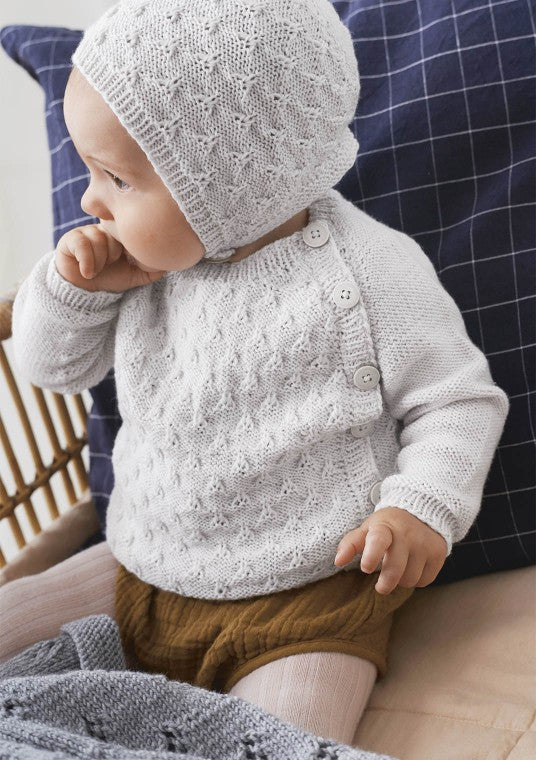 I denne kolleksjonen finner du hentesett til nyfødte og tidløse basics til baby og smårollinger. Noen design er helt nye slik som skjønne blåklokke, spire og kule lille trille, men vi har også tatt tak i gjengangere vi er glad i. Kløvermønsteret er satt sammen med et bærestykke i halvpatent. Resultatet ble tidløst og veldig fint synes vi. Popcorn er også noe vi har brukt mye av til store og små. Jakken og kysen i denne kolleksjonen er både lekne og klassiske på samme tid, en herlig kombinasjon.