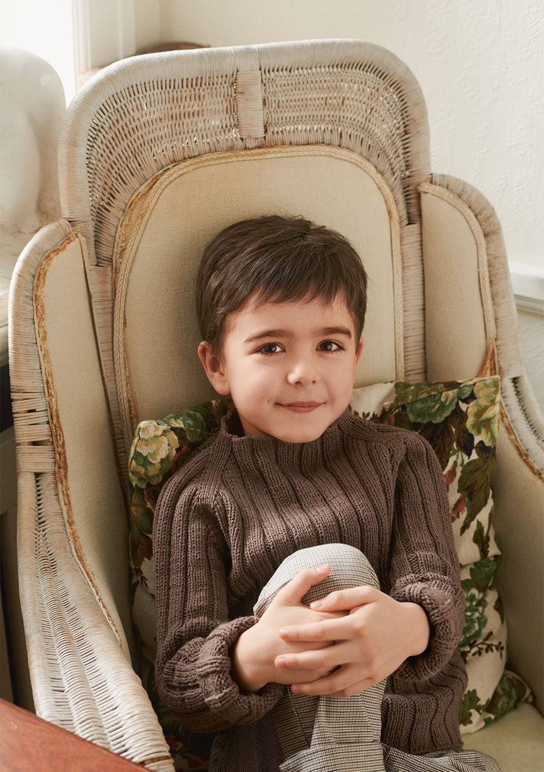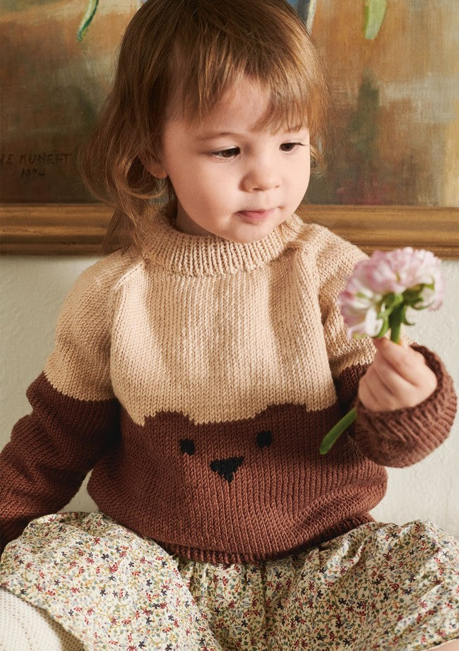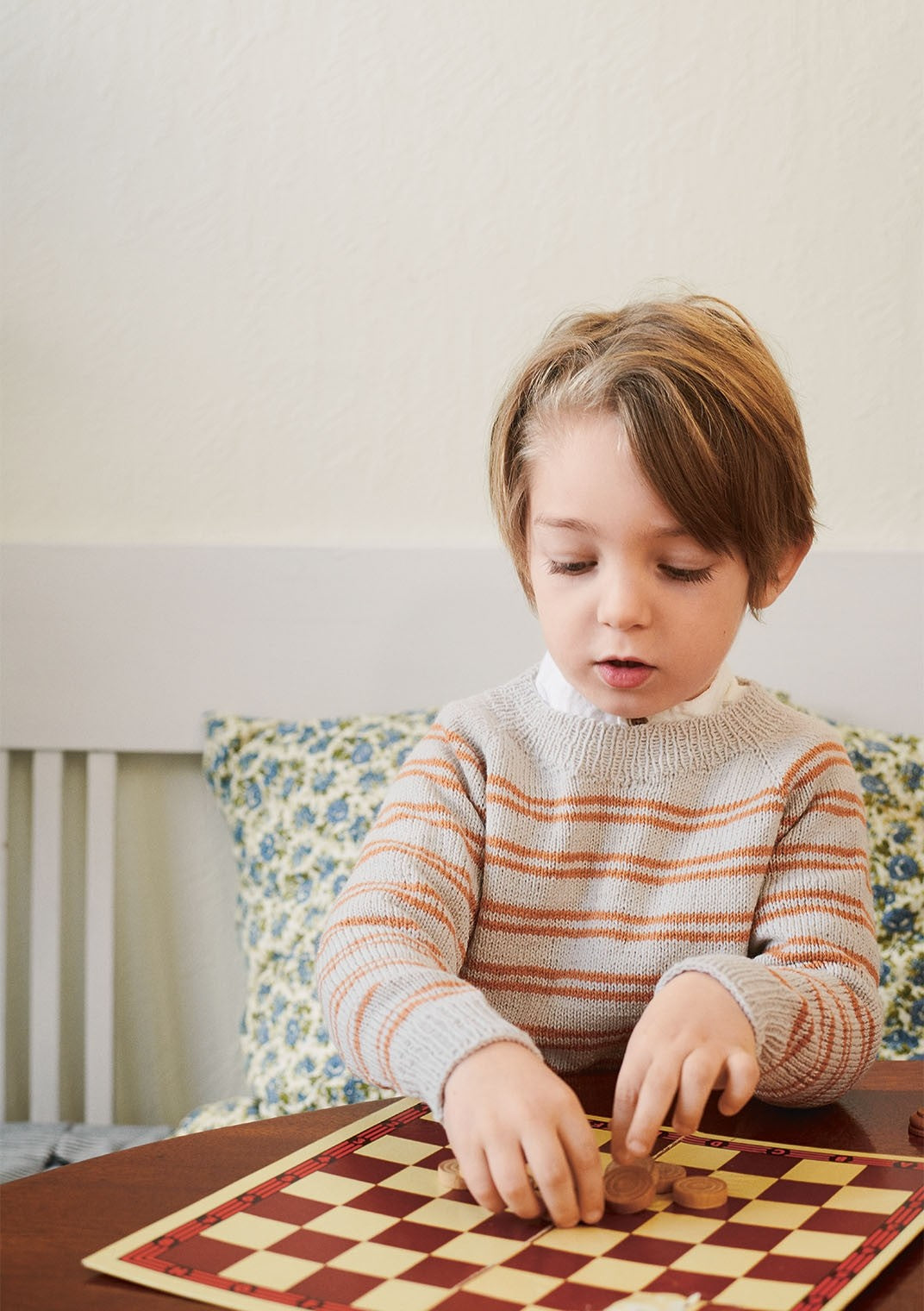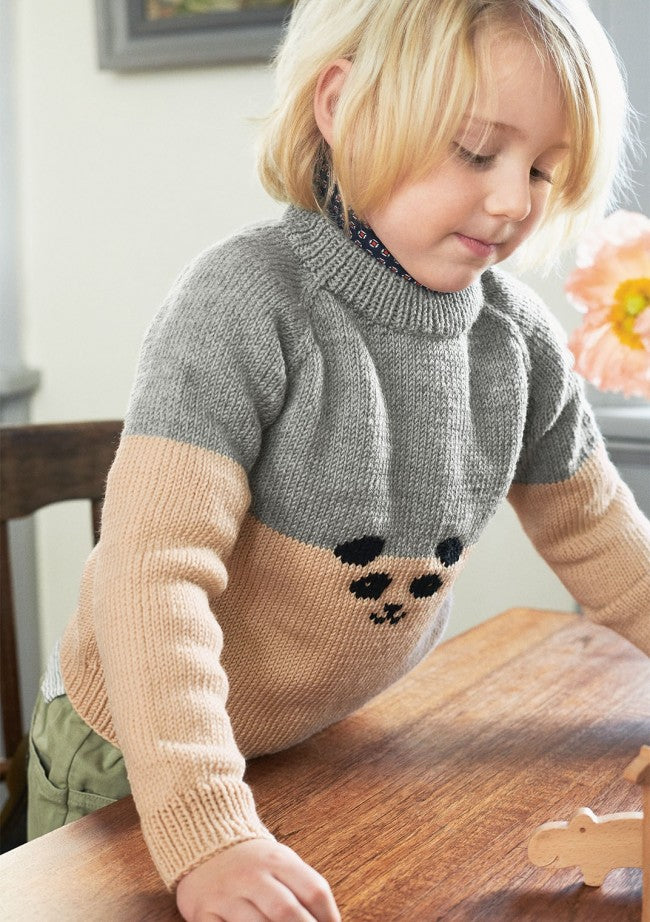 I kolleksjonen finner du enkle konstruksjoner som er morsomme å strikke. En av favorittene våre er Billys stripegenser. En litt oversize genser, strikket ovenfra og ned. Peters ribbgenser har du sett i ulike varianter i tidligere kolleksjoner. Denne gangen er ribbsekvensen litt annerledes, shapen er også mer oversize, og den er strikket ovenfra og ned. Vi har to varianter i denne kolleksjonen, en med enkel og en med dobbel tråd. Popcorn slipover ble veldig populær i høstens kolleksjon, nå får du den også som jakke. Både vest og jakke finnes også i damestørrelser, så mor og barn kan matche hvis de vil. Elsa genseren er rask, enkel og morsom å strikke og den finnes også til mor. Alfreds genser er enkel og rask å strikke. Pandagenseren og Bjørnegenseren kan lett bli favoritter hos barna, super søte og enklere enn du tror å strikke. Ansiktene broderes etterpå med maskesting og jammen kan du ikke lage en pandabukse også! Pauls perleribb bukse er god, myk, elastisk og utrolig fin i uttrykket. Buksen strikkes ovenfra og ned. Simpelthen stripegenser, strikkes ovenfra og ned. God strikk! Popcorn vest og jakke, i tillegg til Elsa genseren finnes til dame i 2103 mykt til dame.