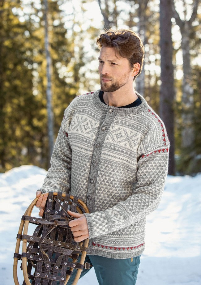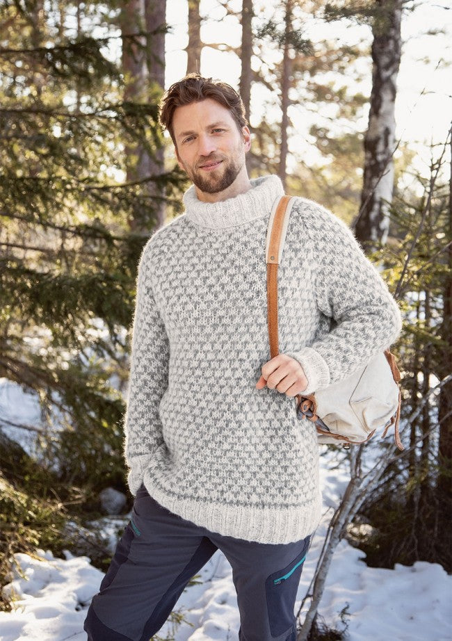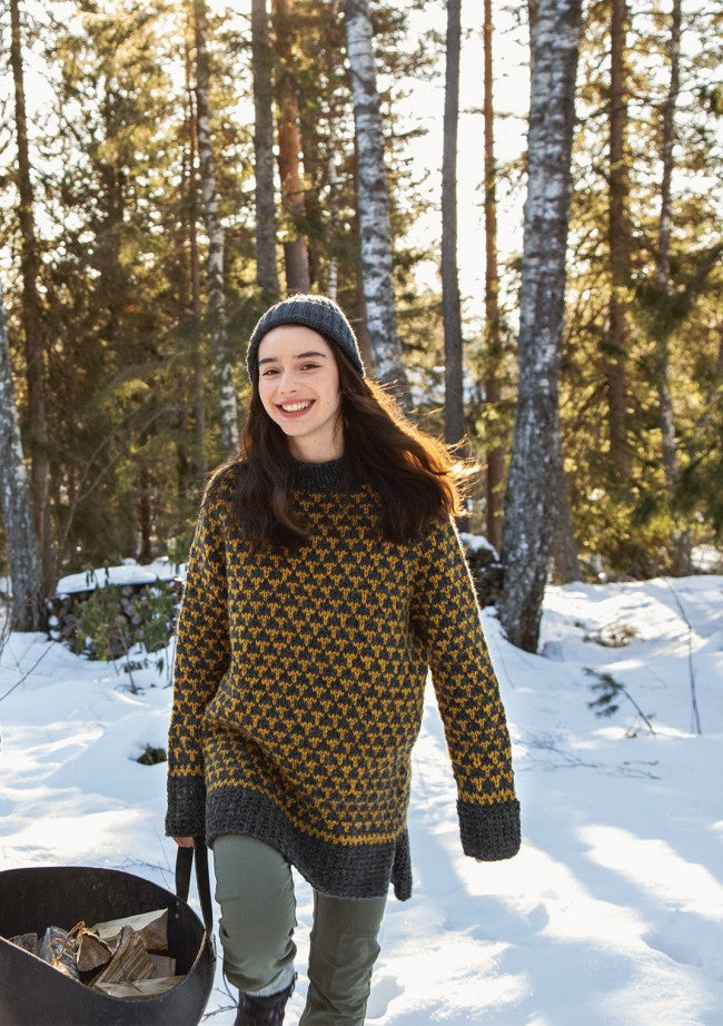 Designer Olaug Kleppe har valgt ullens naturlige varmgrå farge i kombinasjon med plantefargene fra det norske turlandskapet vi er så glade i. Det blir nesten som en kamuflasjepalett med naturtoner det er behagelig å lene blikket på. Da Den Norske Turistforening fylte 150 år, kom denne vakre kolleksjonen til på oppdrag fra ukebladet Familien, og nå lanseres den i sin helhet i samarbeid med Sandnes Garn. Olaug Kleppe forteller hvordan hun har sett for seg alle de som gjennom årene har gått på de merkede stiene og overnattet i hyttene, da hun skapte denne serien av tradisjonelle design. Det subtile T-mønsteret som går igjen i designet symboliserer de T-merkede rutene, stiene, som fører inn til arnepunktene; hyttene som det er godt og trygt å komme frem til for en hvil, litt varme og noe å spise. Så blir kanskje plaggene også slike trygge varme rom å bære rundt på, om de har fargene til en hytte, en granskog eller en snøkledd vidde. De bærer alle hvert sitt hyttenavn.