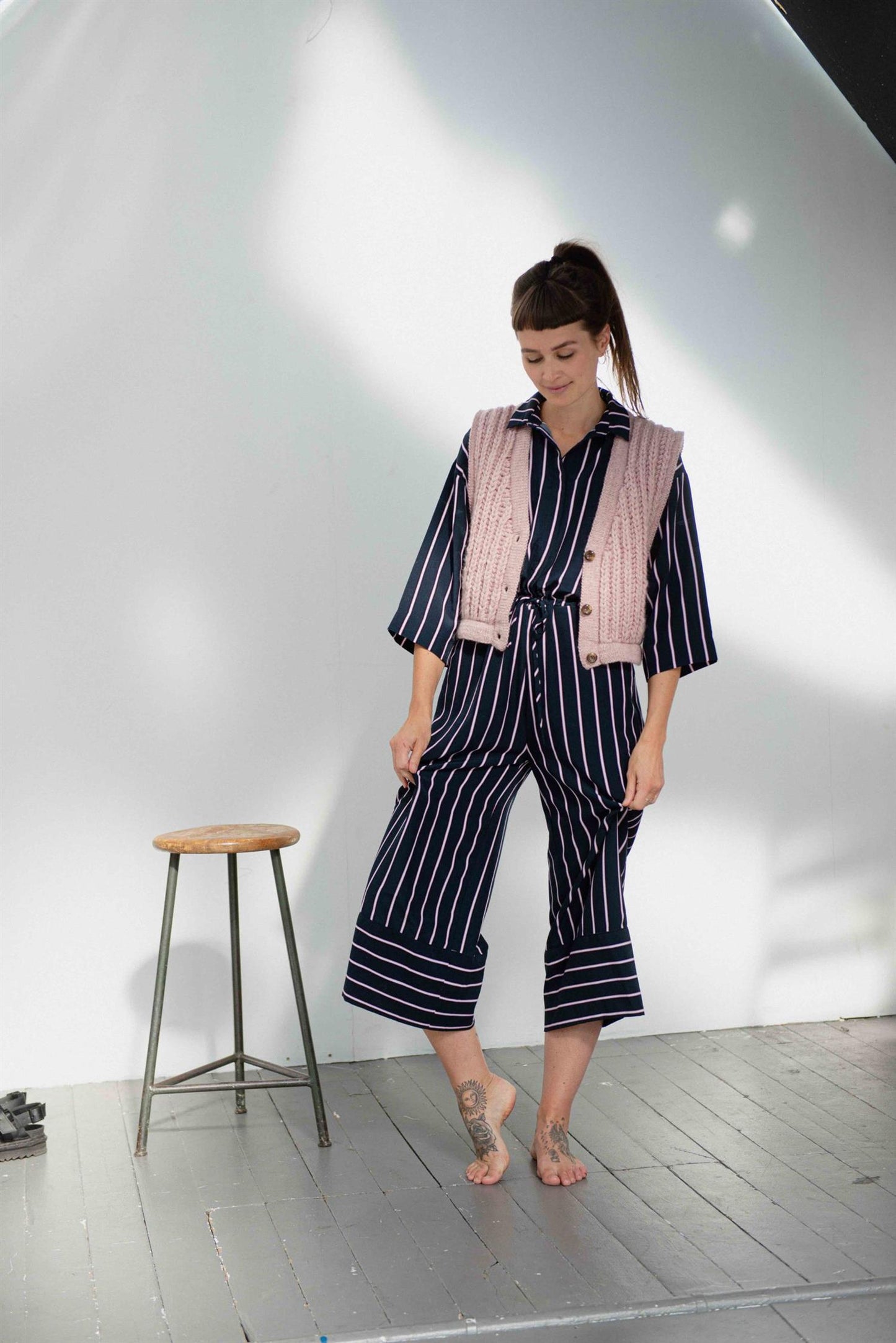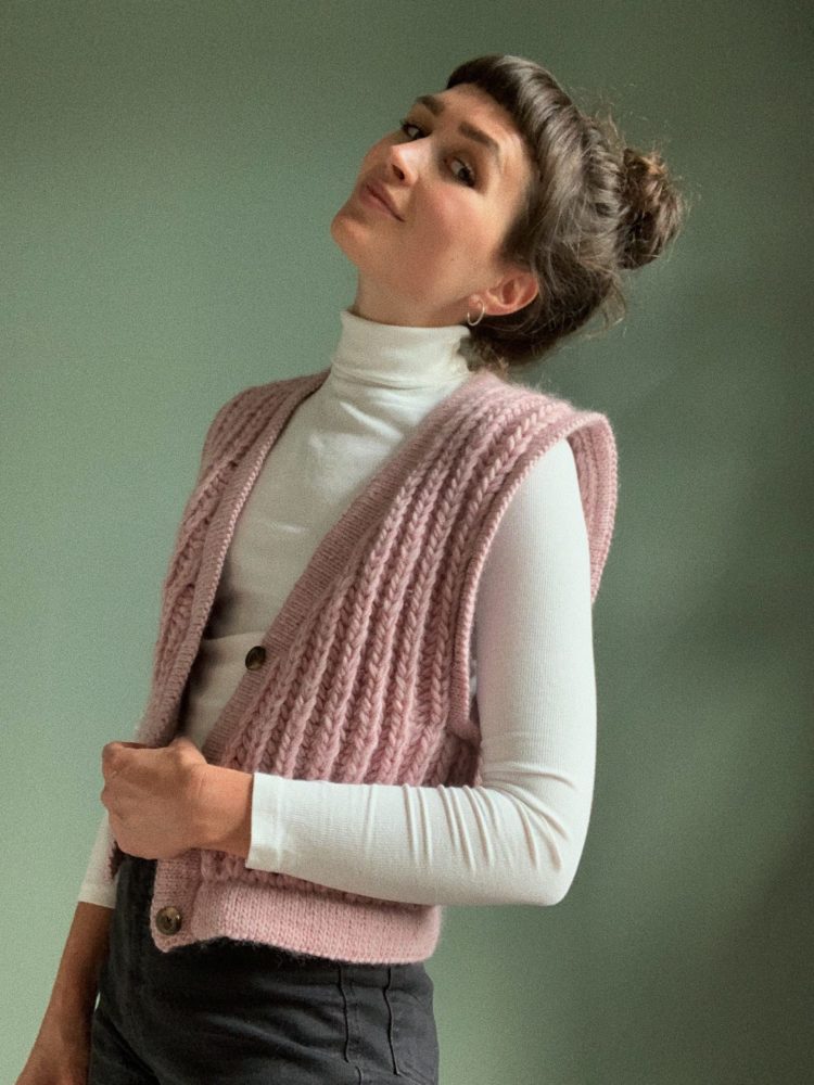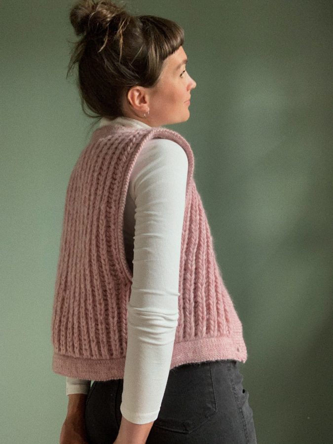 Chunky Vest er en tykk vest i patentstrikk, og passer like godt på kjølige sommerkvelder med t-skjorte til som under vinterjakken en kald januarmorgen. Vesten strikkes frem og tilbake, nedenfra og opp, i patent med dobbel tråd på tykke pinner. Brettekantene plukkes opp til slutt og strikkes med enkel tråd på tynnere pinner. Denne kombinasjonen av pinnestr og teknikk gir en pen effekt, med det grove mot det glatte. Patenten er tøyelig og beveger seg i bruk. Kantene i glattstrikk er med på å holde fasongen på plass, og gir plagget en fin finish.