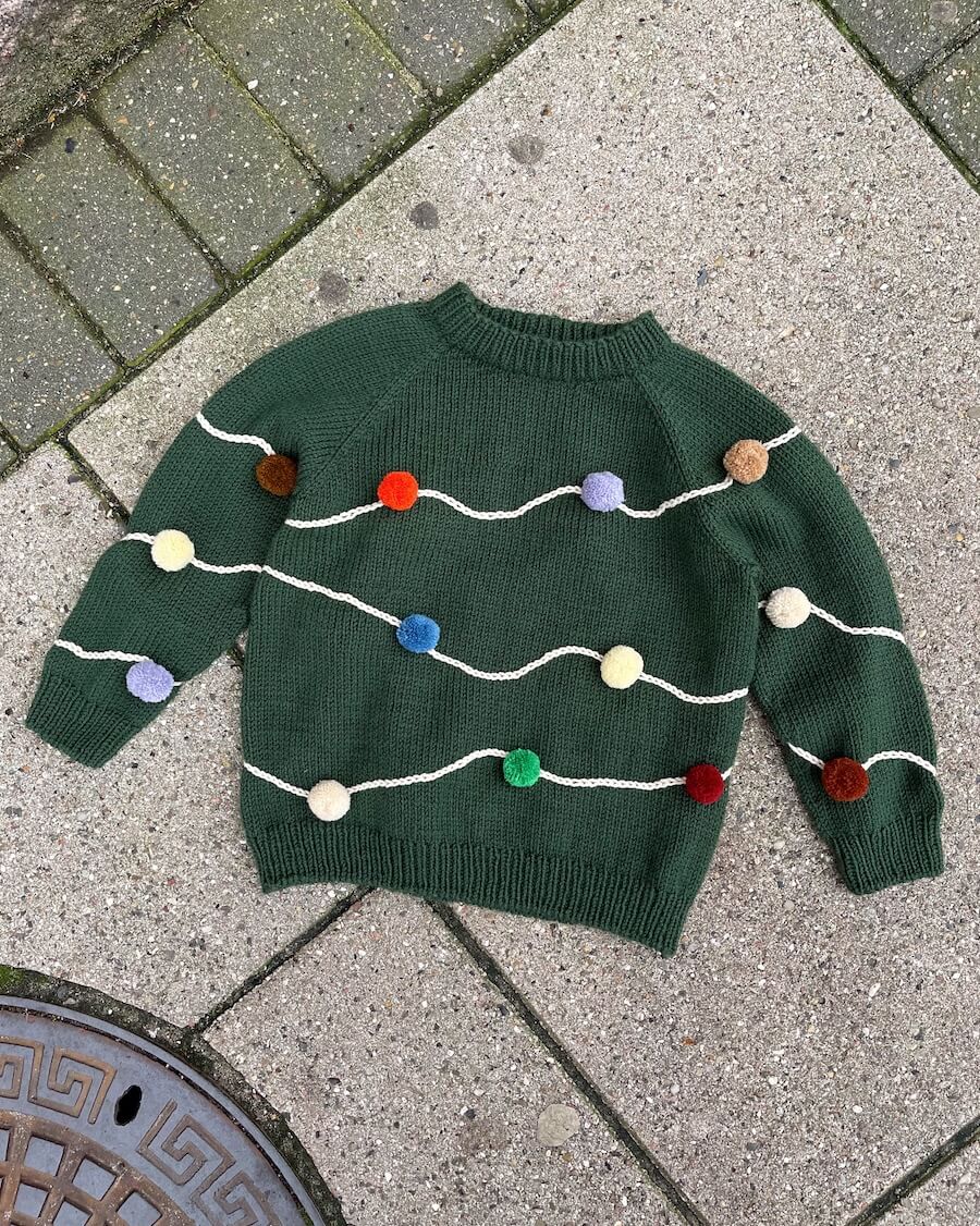Let’s Christmas Sweater strikkes ovenfra og ned i glattstrikk. Halsen brettes og strikkes ned, og det strikkes forkortede pinner (vendepinner) for å forme halsutskjæringen, hvoretter det strikkes raglanøkninger på bærestykket. Til slutt hekles det kjedemasker på genseren, og det monteres pompons i forskjellige farger.