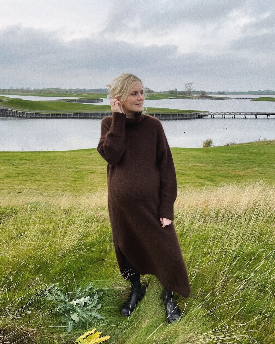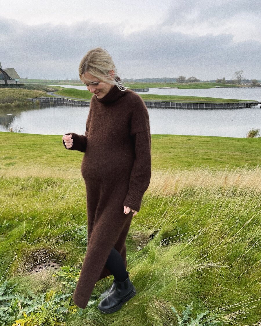 Den brune Chestnut Dress er strikket i Pelsuld 8/2 fra Hjelholt Uldspinderi i fargen Kastanje [21] sammen med Brushed Lace fra Mohair by Canard i fargen Kaffe [3041].