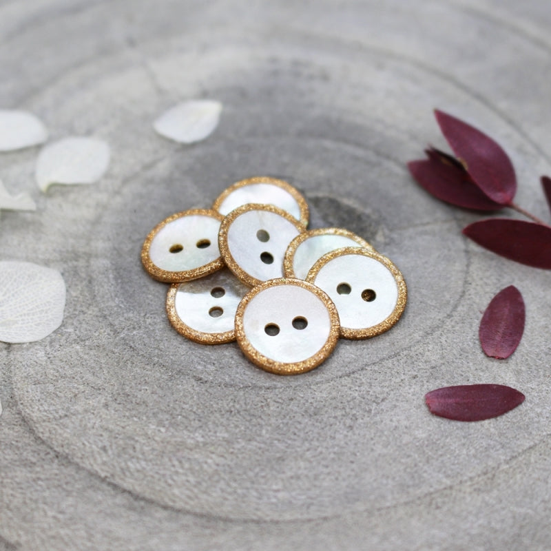 The "Glitz" buttons are small buttons with glittery edges on an akoya mother-of-pearl base with slightly iridescent reflections. These buttons bring a touch of delicacy and subtle shine to your clients' creations.