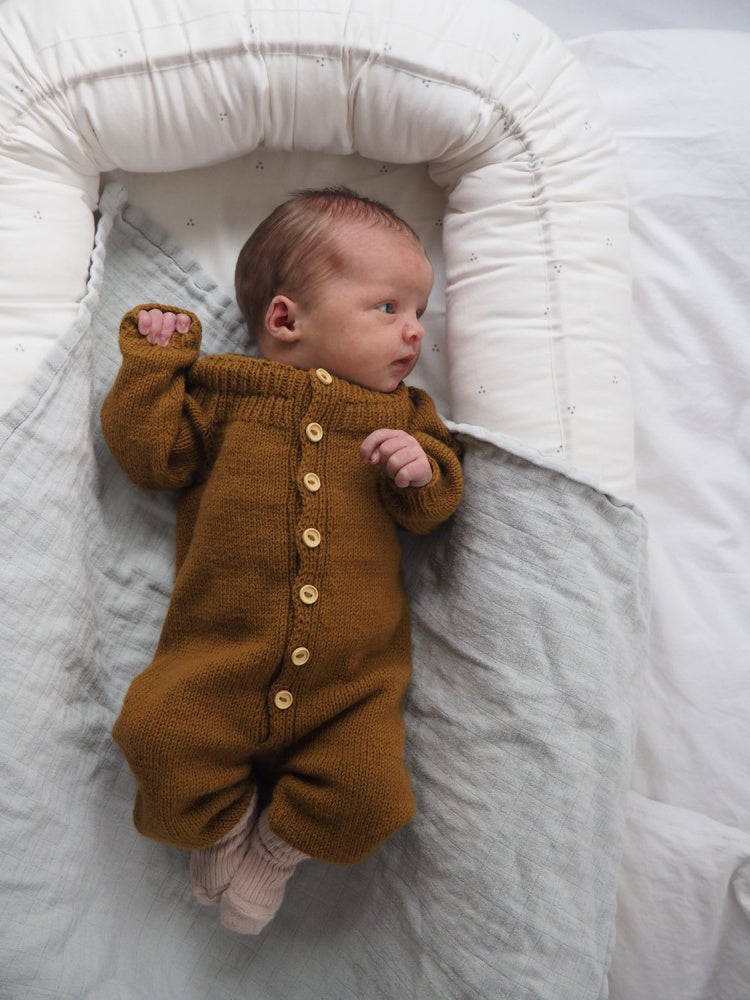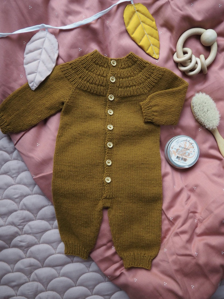 Ankers Heldrakt strikkes først frem og tilbake på rundpinne, før den til slutt samles rett før bena og strikkes rundt. De første og siste 7 m på p strikkes i ribb og overlapper for å danne knappestolper. Underveis strikkes knapphull. Les om knapphull nedenfor før du går i gang med å strikke. Ermer og ben strikkes rundt på strømpepinner eller med Magic Loop-teknikk.