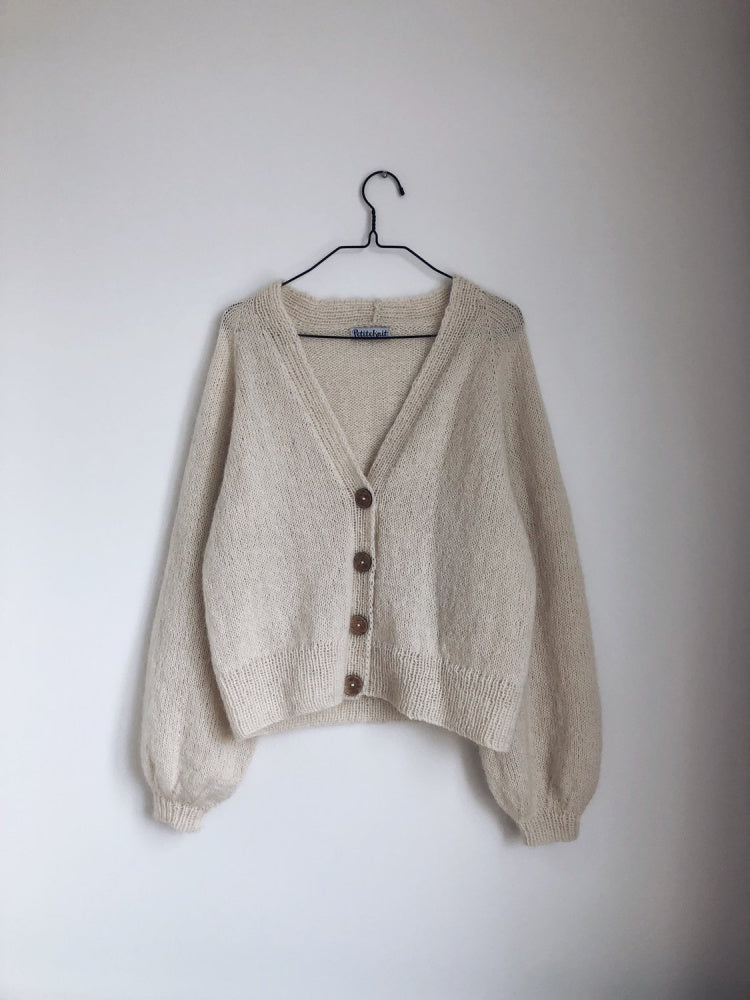Den hvite ballongcardigan på bildet er strikket i Sagal og en råhvit Tilia. Begge fra Filcolana.