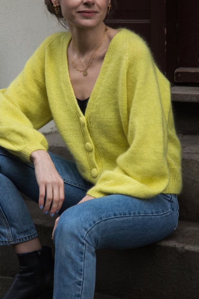 Materialer: 250 (300) 300 (300) 350 g Arwetta fra Filcolana (50 g = 210 m) sammen med 125 (150) 150 (150) 175 g Tilia fra Filcolana (25 g = 210 m) eller 125 (150) 150 (150) 175 g Kid Seta fra Gepard Garn (25 g = 210 m), 4 knapper (ø = 20 – 25 mm)