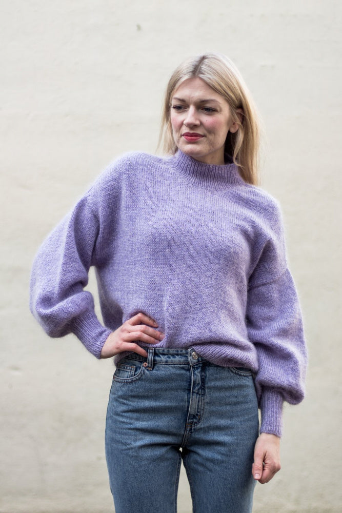Den lilla Ballonggenseren på bildet er strikket i Arwetta i fargen Lavender Frost (267) fra Filcolana og Tilia fra Filcolana i fargen Fresia (353).