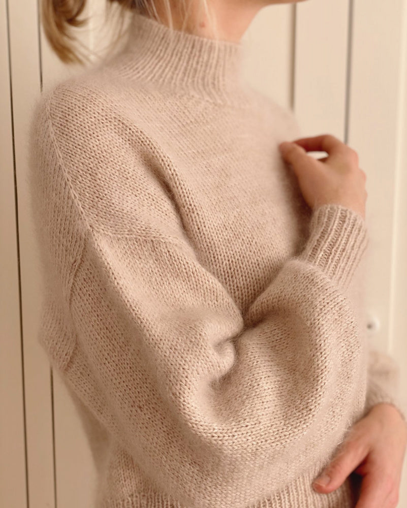 Den brune Ballonggenseren på bildet er strikket i Arwetta i fargen Sand fra Filcolana (971) og Kid Seta fra Gepard Garn i fargen beige/grå (148).