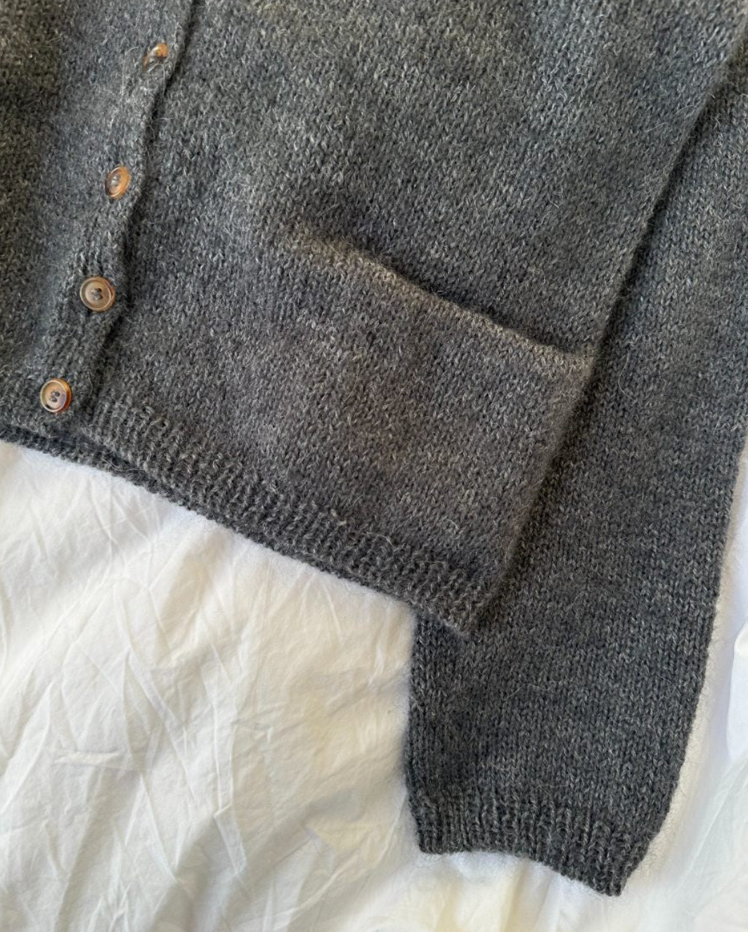 Den grå Copenhagen Cardigan er strikket i Alpaca 2 fra Isager i farge 4S sammen med Silk Mohair fra Isager i farge 47.