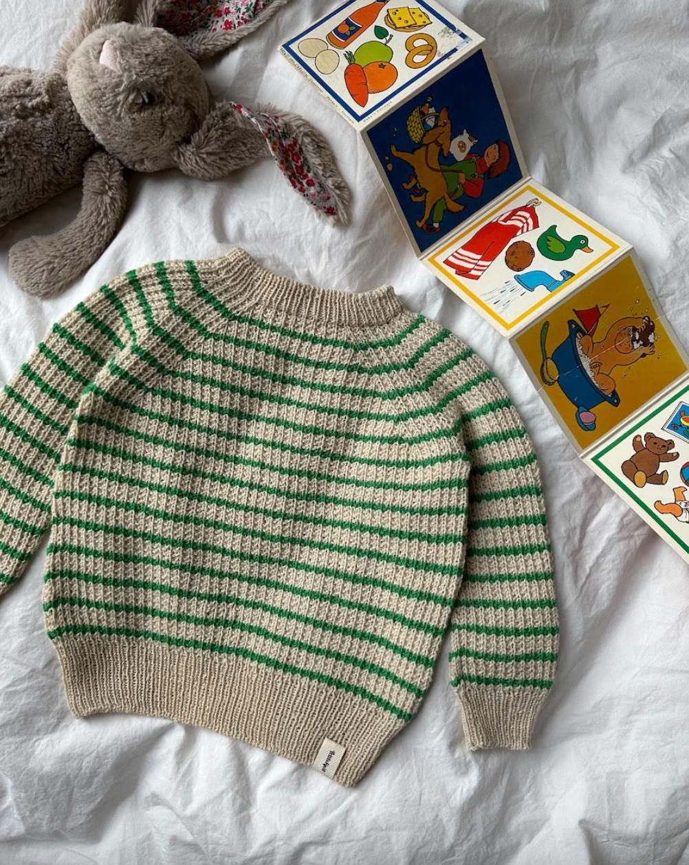 Den hvite og mørkgrønne Friday Sweater Mini er strikket i Sunday fra Sandnes Garn i fargene Kitt [1015] og Into the woods [9882].
