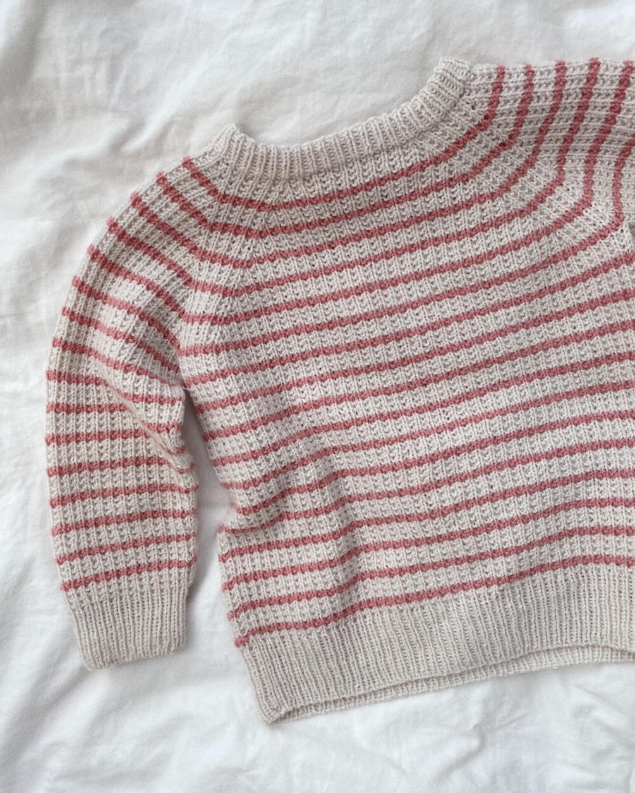 Friday Sweater strikkes ovenfra og ned i perleribb med raglanøkninger. Halskanten strikkes i ribb og strikkes ned. Ermer og bol avsluttes med en ribbkant.