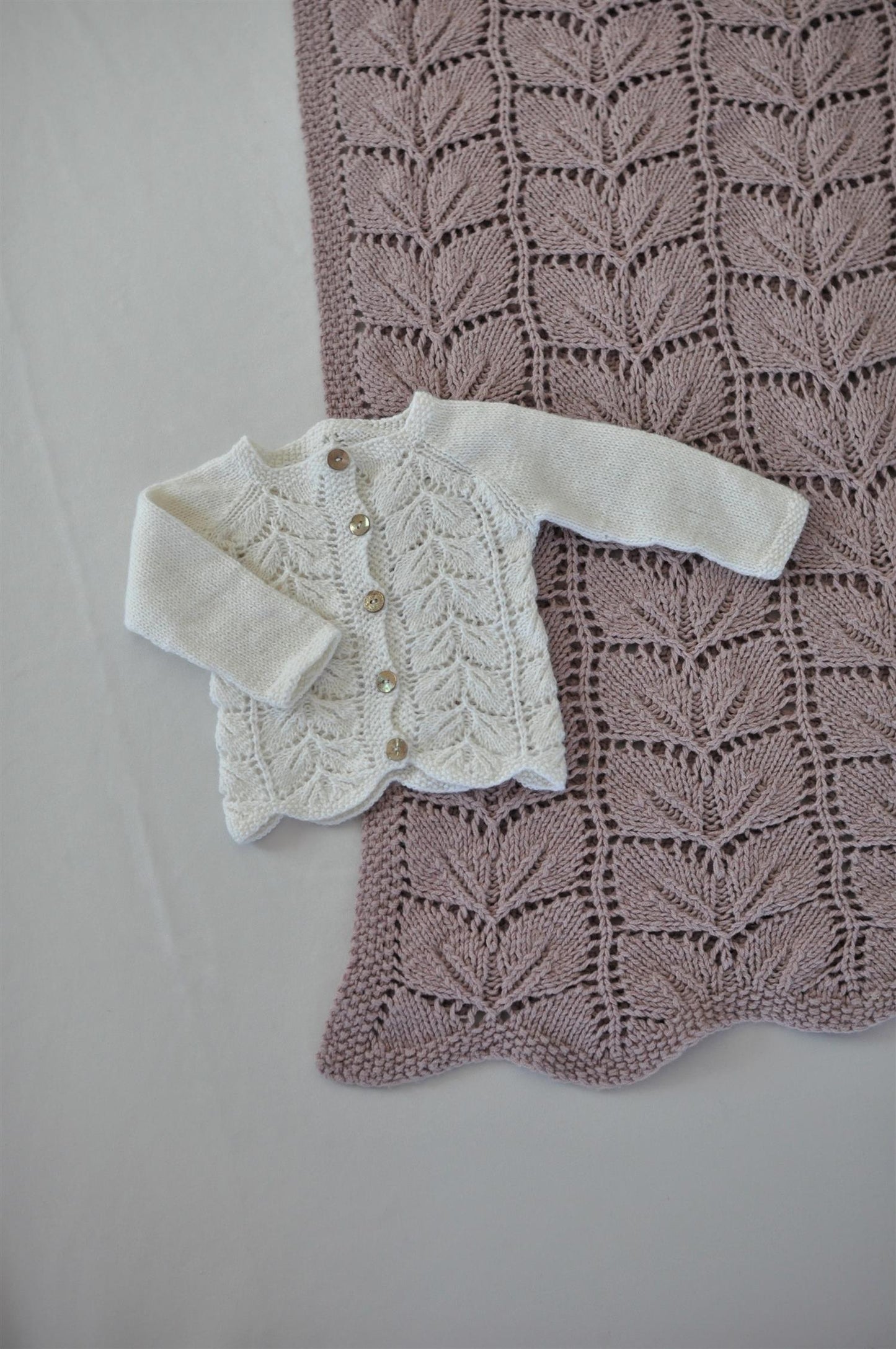 Jakken har en nydelig bladstruktur på bol som strikkes etter diagram. Du strikker jakken nedenfra og opp, frem og tilbake på rundpinne. Den har glattstrikkede ermer med perlestrikkede kanter. Knappestolper strikkes underveis.