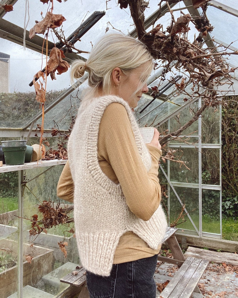 Holiday Slipoveren på bildet er strikket i Snefnug (Lys beige) fra CaMaRose og Silk Mohair (farve 6) fra Isager.
