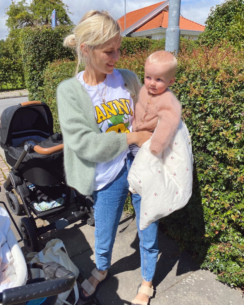 Den lyserøde cardigan på billedet er strikket i Tynn Silk Mohair fra Sandnes Garn i farven Pudderrosa 3511.