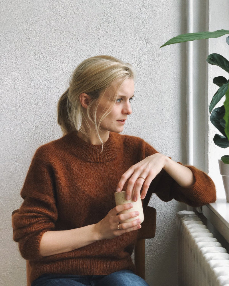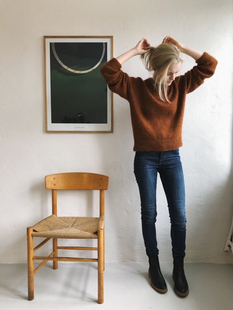 Den rødbrune Oslosweater på bildene er strikket i en tråd Tibet (17) fra CeWec og en tråd Tilia (Red Squirrel) fra Filcolana.