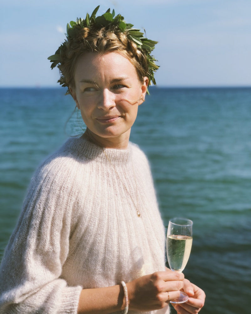 Garnforslag: 200 (225) 250 (250) 275 (325) 350 g Tynn Silk Mohair fra Sandnes Garn (25 g = 212 m) eller Silk Mohair fra Isager Yarn (25 g = 212 m) eller Soft Silk Mohair fra Knitting For Olive (25 g = 210 m). Merk at det strikkes med dobbel tråd og at garnforbruket angir totalt garnforbruk. Hvis ermerne strikkes med trekvart lengde, kan garnmengden reduseres med omtrent 25 g pr. størrelse.