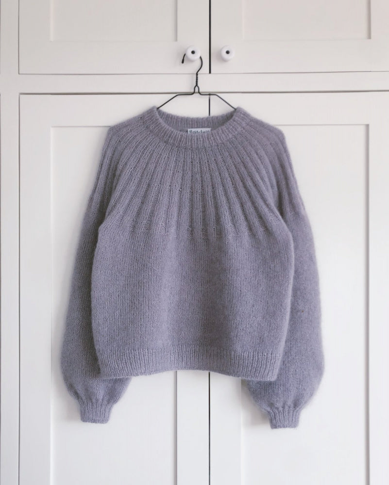 Den lilla Sunday Sweater – Mohair Edition er strikket i Tynn Silk Mohair fra Sandnes Garn i farge 4631 Støvet Syren.