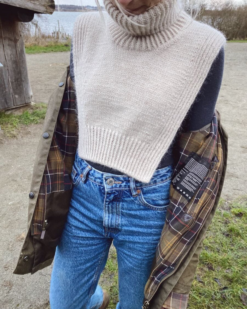 Terrazzo Neck er her strikket i Peruvian Highland Wool (Marzipan) fra Filcolana og Silk Mohair (farve 0) fra Isager Yarn.