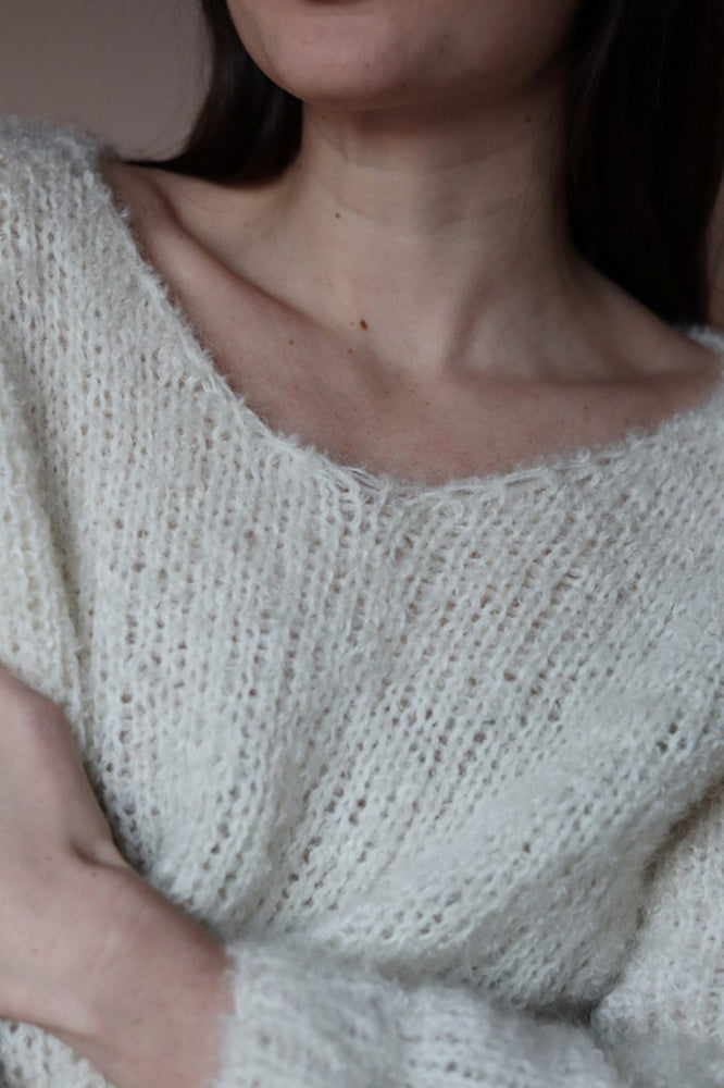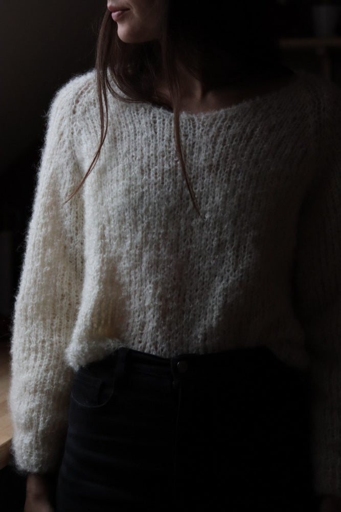 Genseren strikkes nedenfra og opp, med påfølgende raglanfellinger. Den skal være kort og vid, samt helt rett, i modellen. Om du ønsker den innsvingt, kan du strikke ribben på en pinnestr mindre.