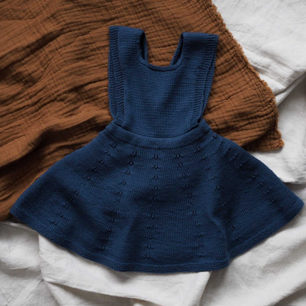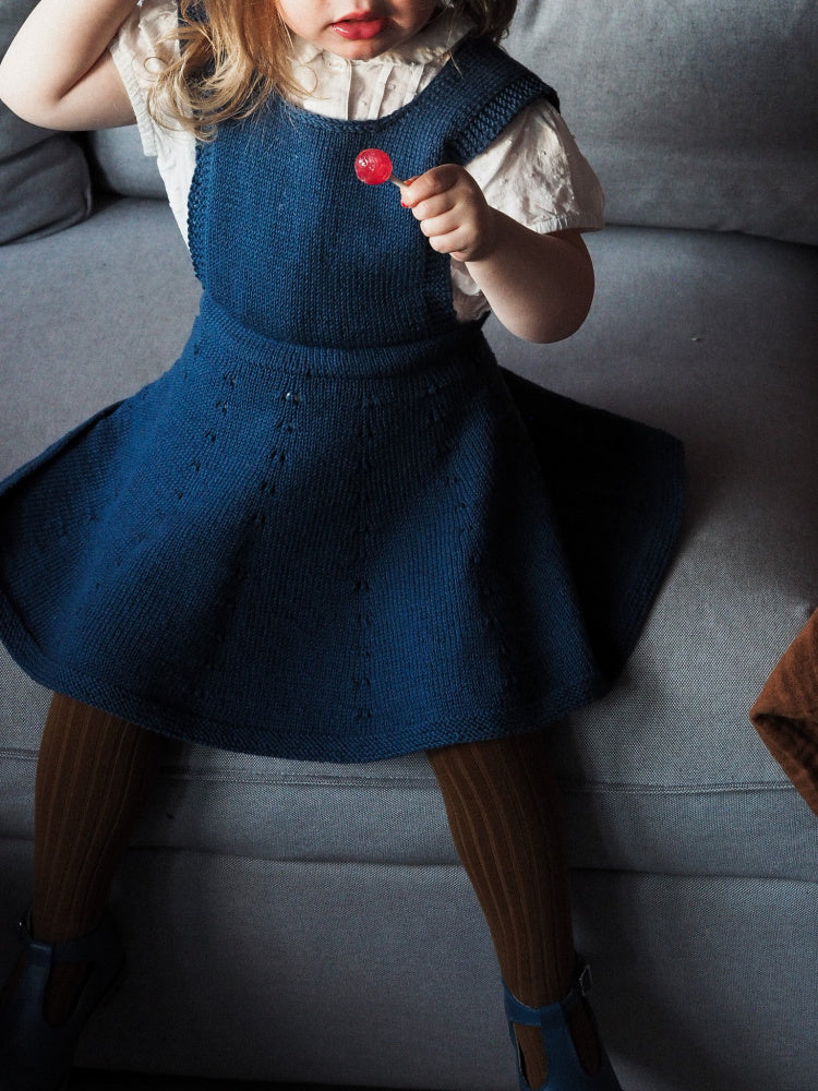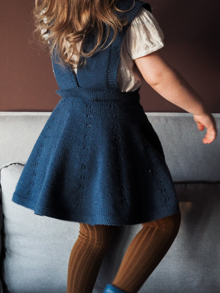 Skjørtet strikkes først før det plukkes opp masker til overdelen. Du kan dermed selv velge om du vil strikke overdelen. Kjolen er fin med en bluse under på vinteren, men kan såklart brukes uten noe under på sommeren.