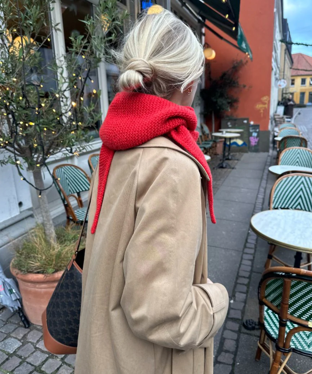 Den røde Sophie Hood er strikket i Eco Cashmere Vintage fra Gepard i fargen Blodappelsin [325].