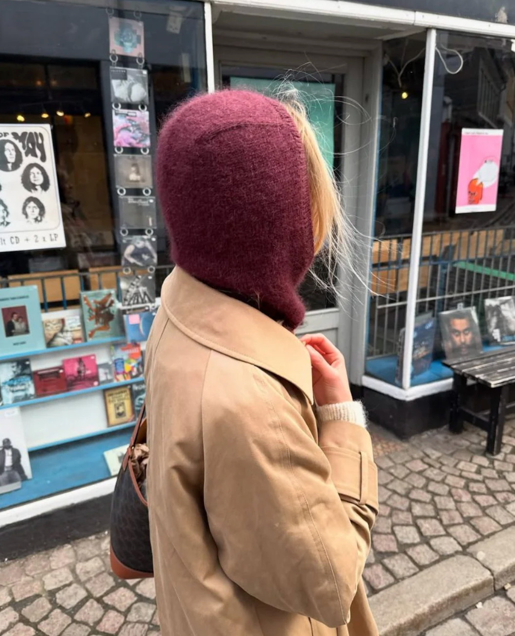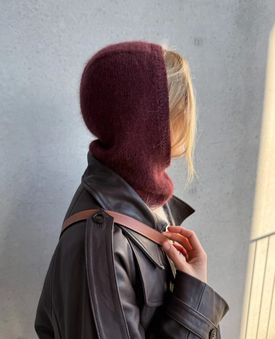 Den burgunderfargede Barbara Balaclava er strikket i Merino fra Knitting for Olive i fargen Bordeaux sammen med Soft Silk Mohair fra Knitting for Olive i fargen Bordeaux.