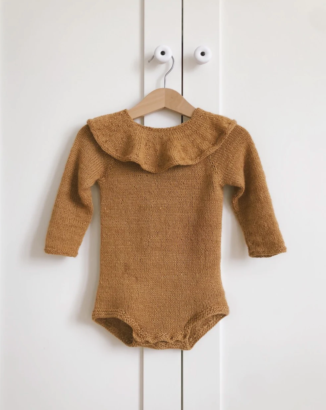 Almas Volangbody strikkes ovenfra og ned med raglanøkninger. Kragen strikkes til slutt ved å plukke opp masker i halskanten. Almas Volangbody lukkes i nakken og skrittet med diskrete trykknapper. Kragen kan med fordel presses med et strykejern ved svak varme etter vask, slik at den blir fin og glatt. Modellen er smal og sitter tett inntil kroppen.